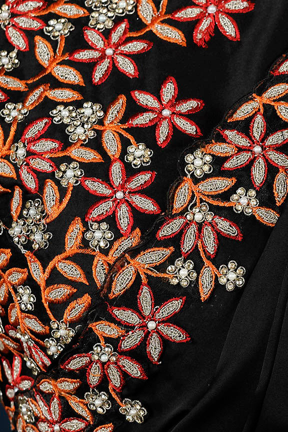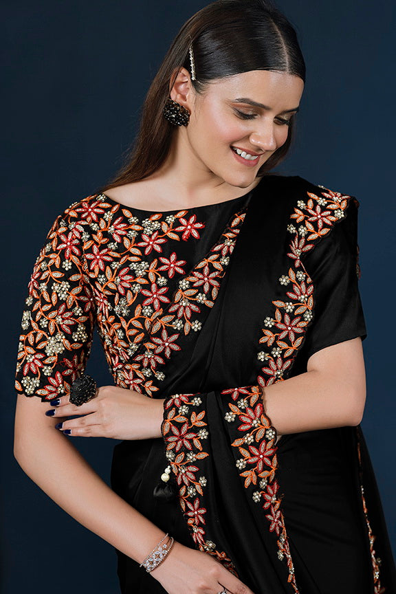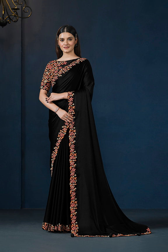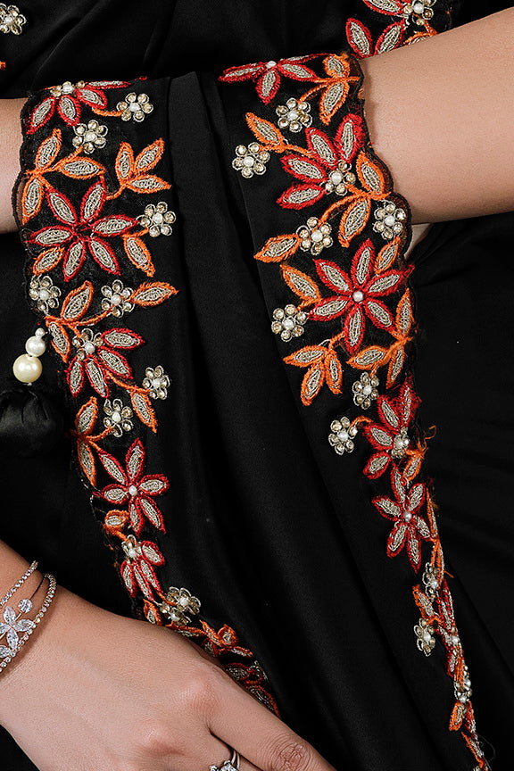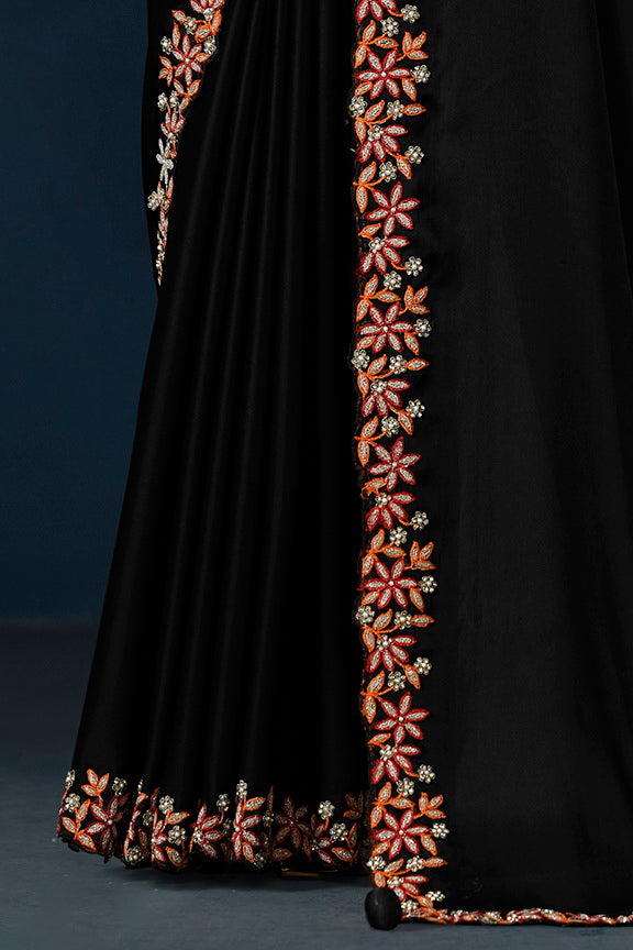 Black Crepe satin silk Thread work with Pure Handwork Saree with Unstitched Blouse