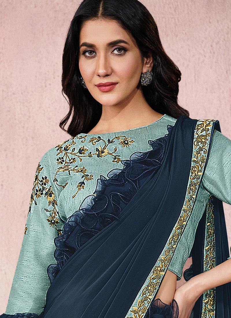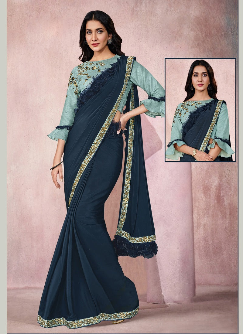 Blue Chiffon Lycra Embroidered Ready to wear Saree with Stitched Blouse