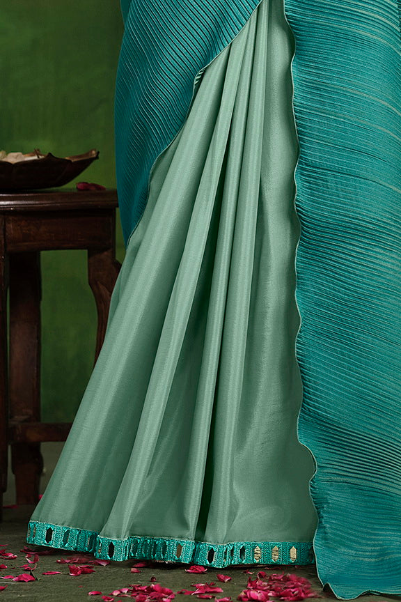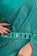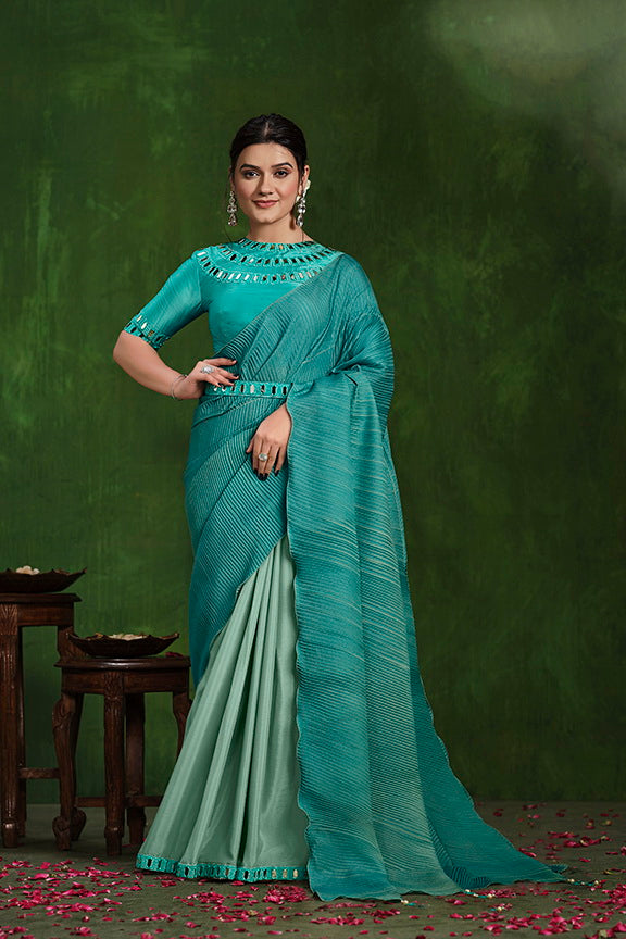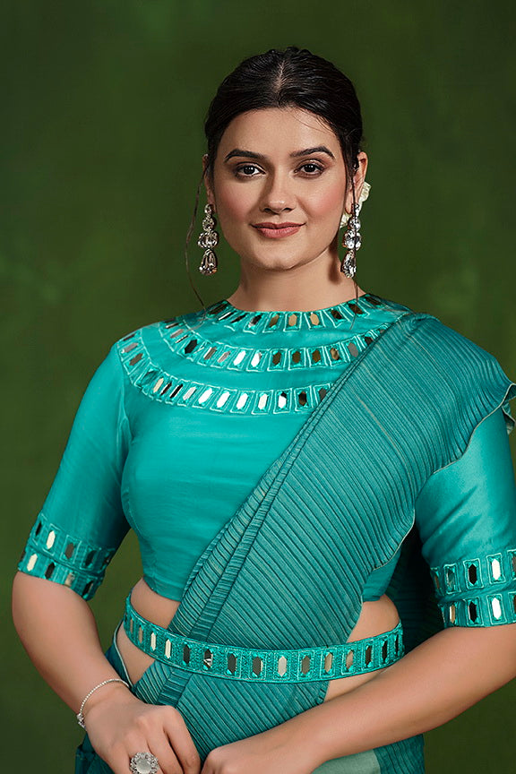 Blue Crepe Silk Georgette Mirror Thread Work Saree with Stitched Blouse