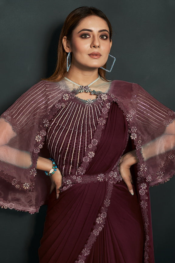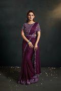 Maroon Satin Silk Ready to Wear Designer Saree with Stitched Blouse