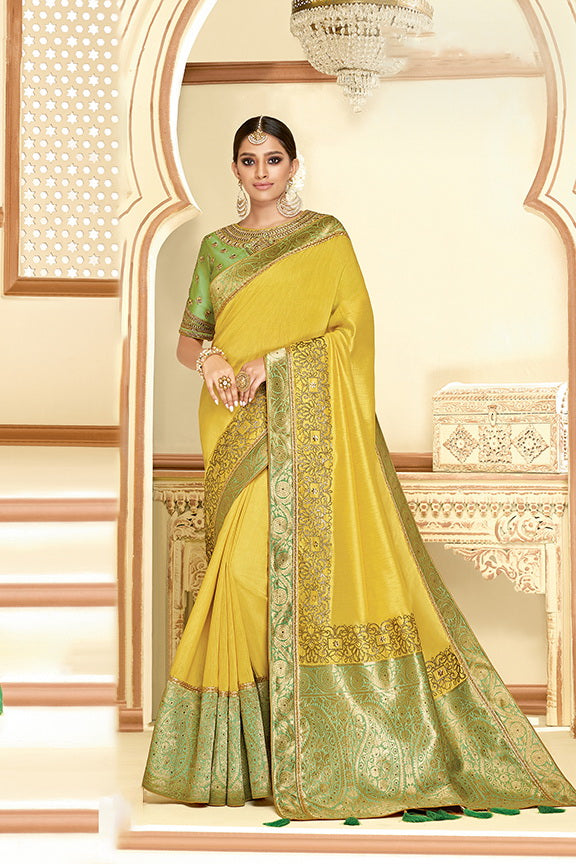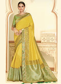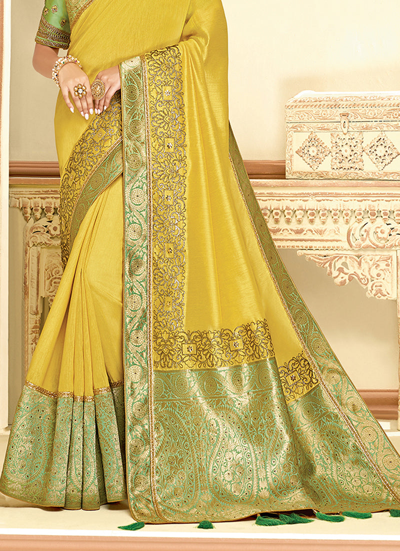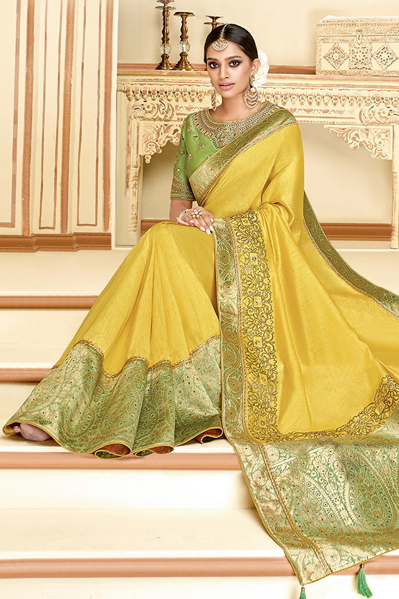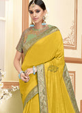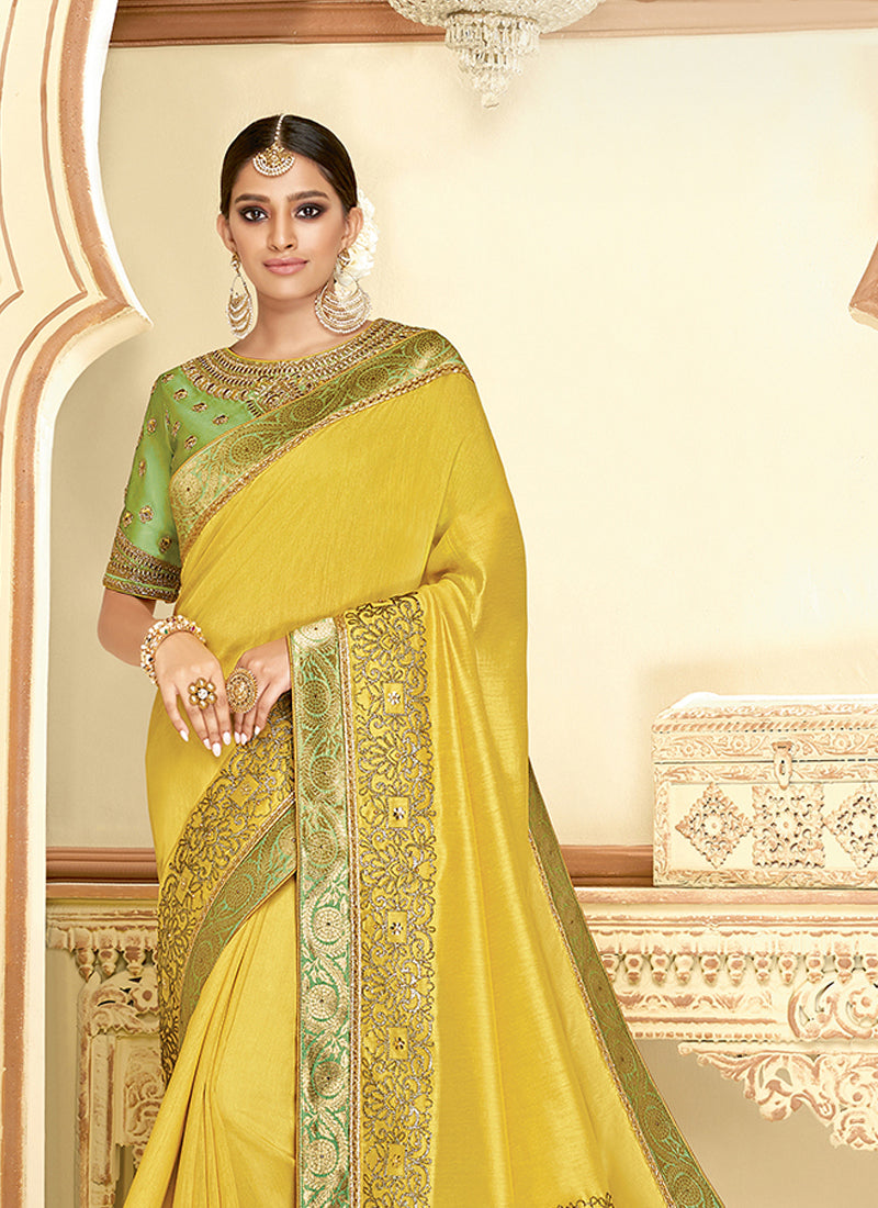 Yellow Satin Silk Embroidered Saree with Unstitched Blouse