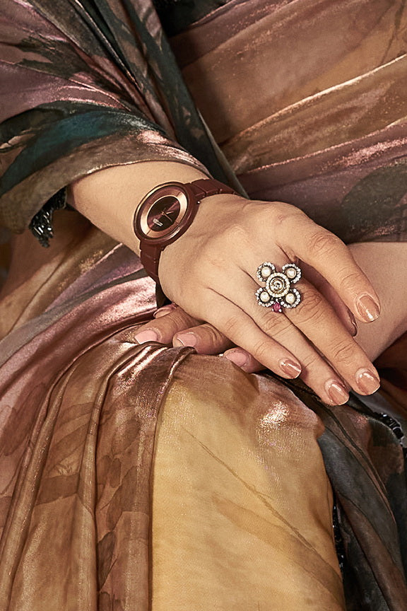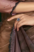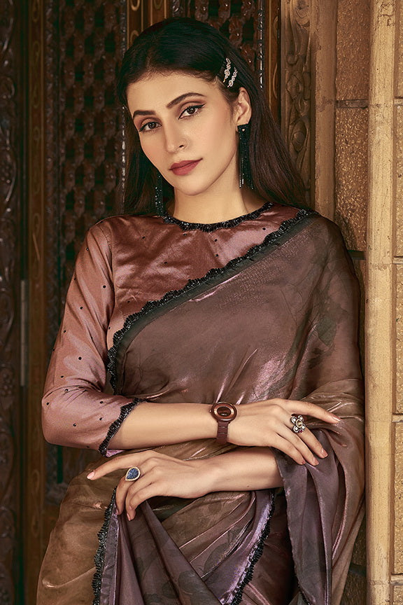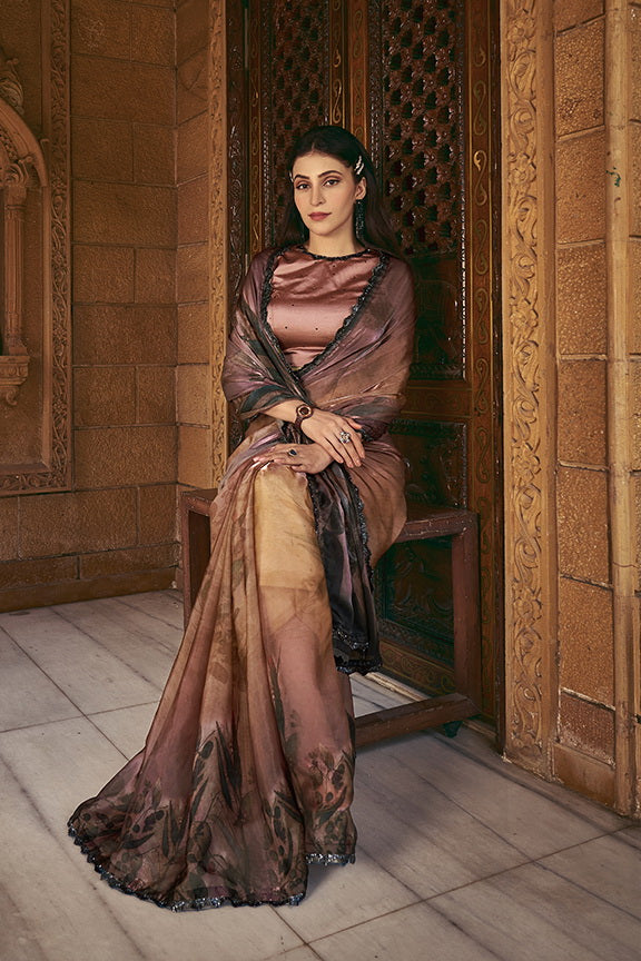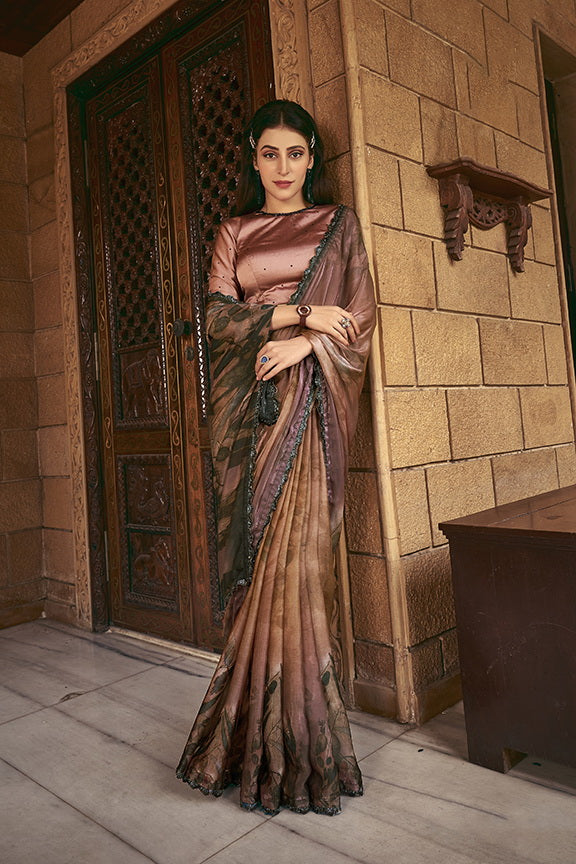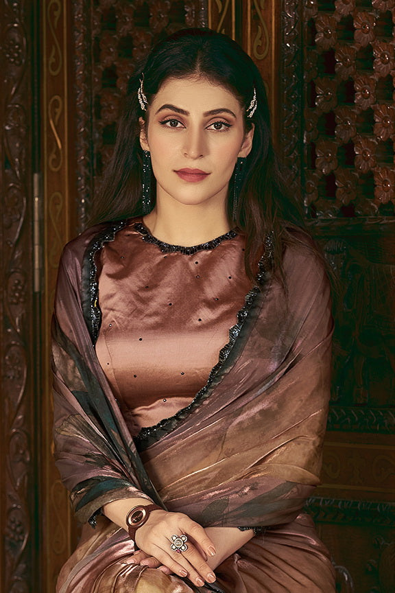 Brown Sparking Satin Silk Printed Saree with Unstitched Blouse