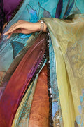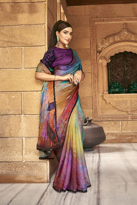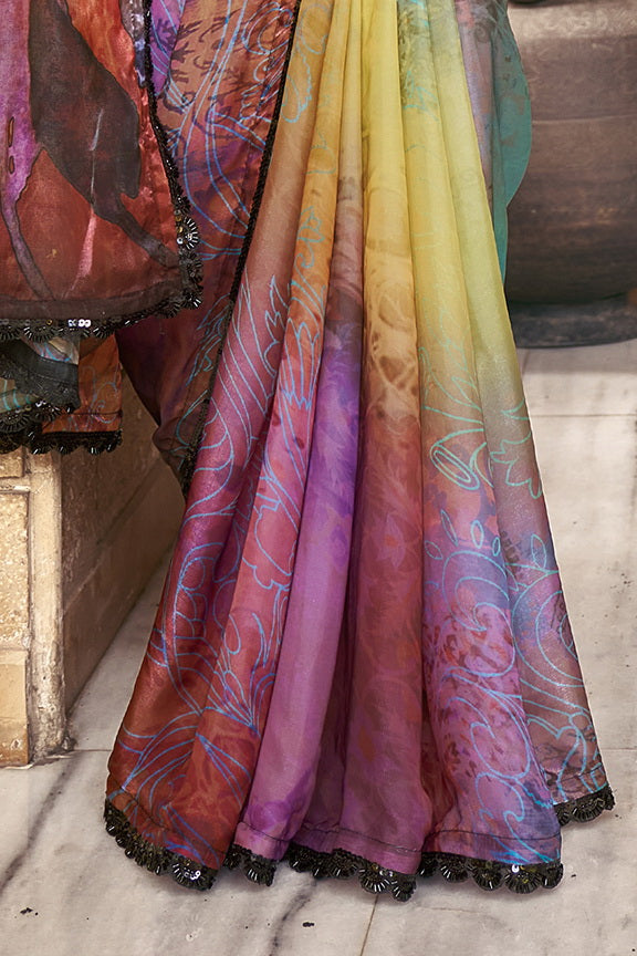 Multicolor Sparking Satin Silk Printed Saree with Unstitched Blouse