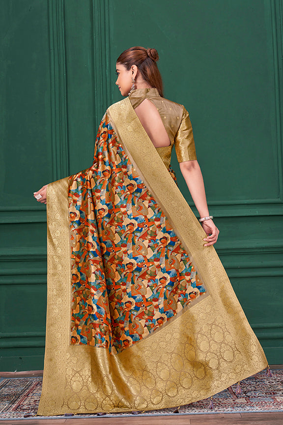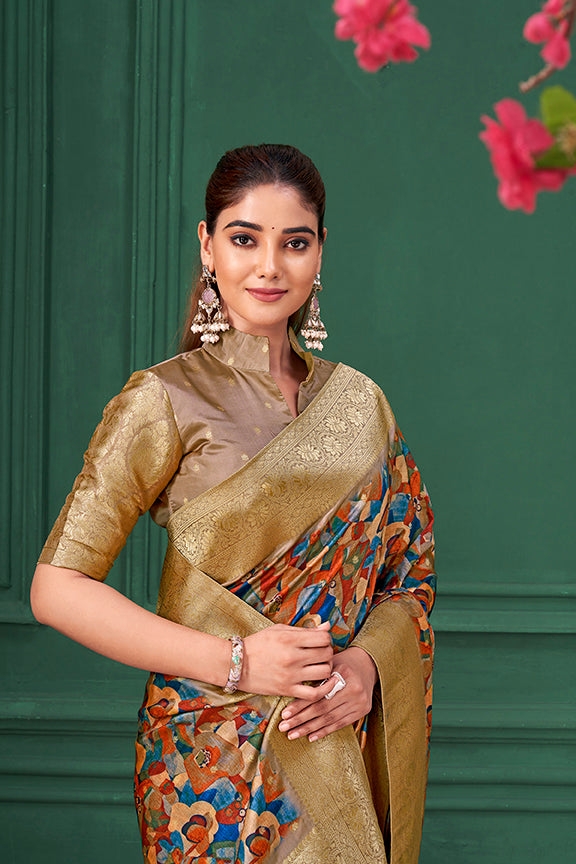 Chiku Tussar Silk Jacquard Abstract Digital Print Saree