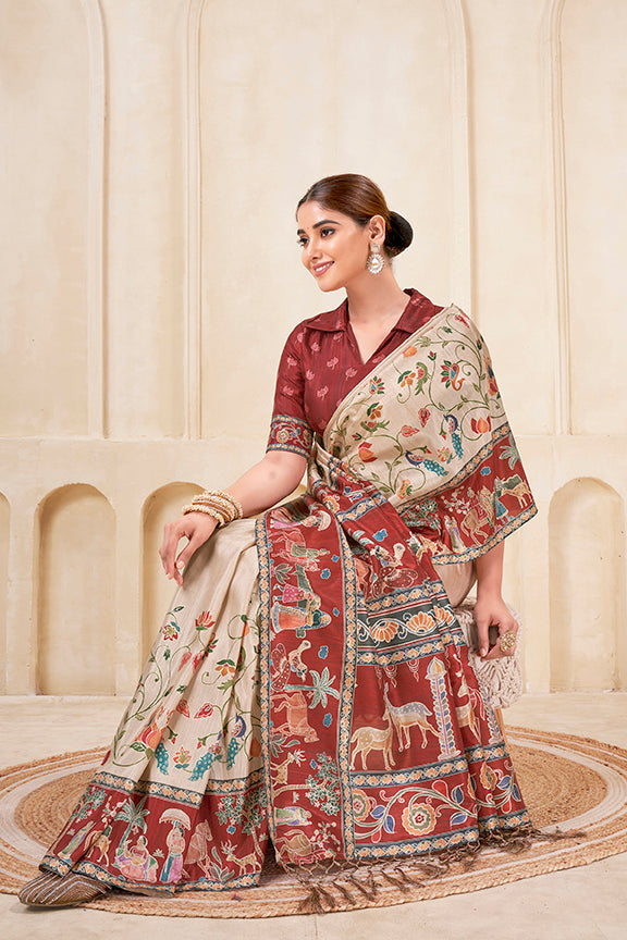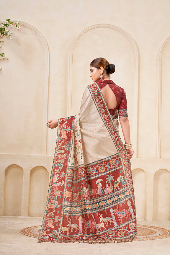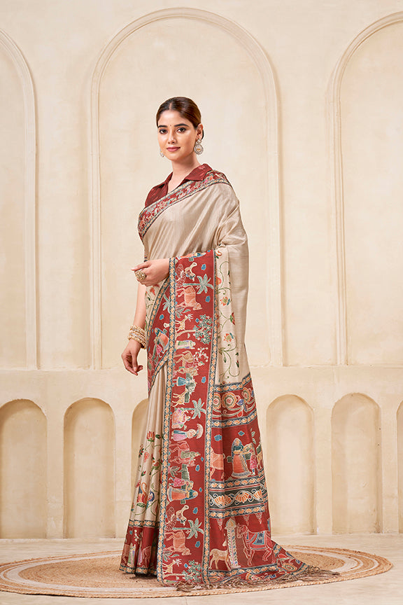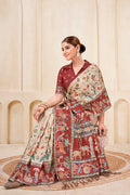 Cream Sambalpuri silk Traditional Digital print with Foil Print Saree