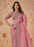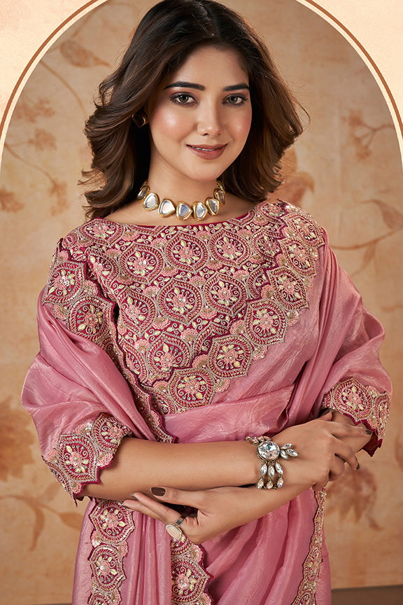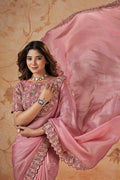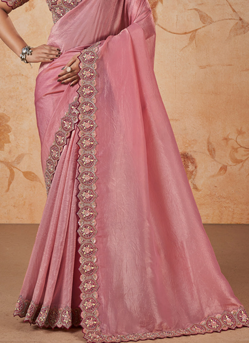 Pink Banarasi Crush Silk Embroidered Saree with Unstitched Blouse