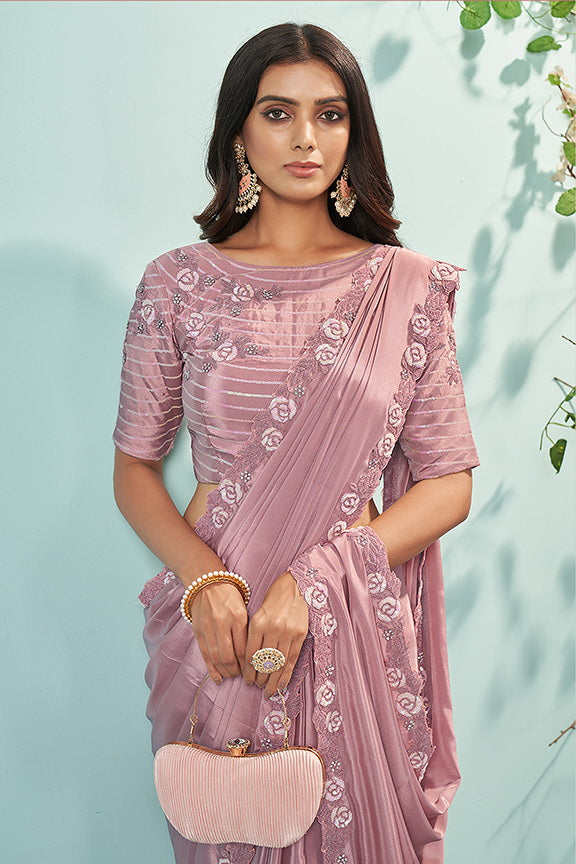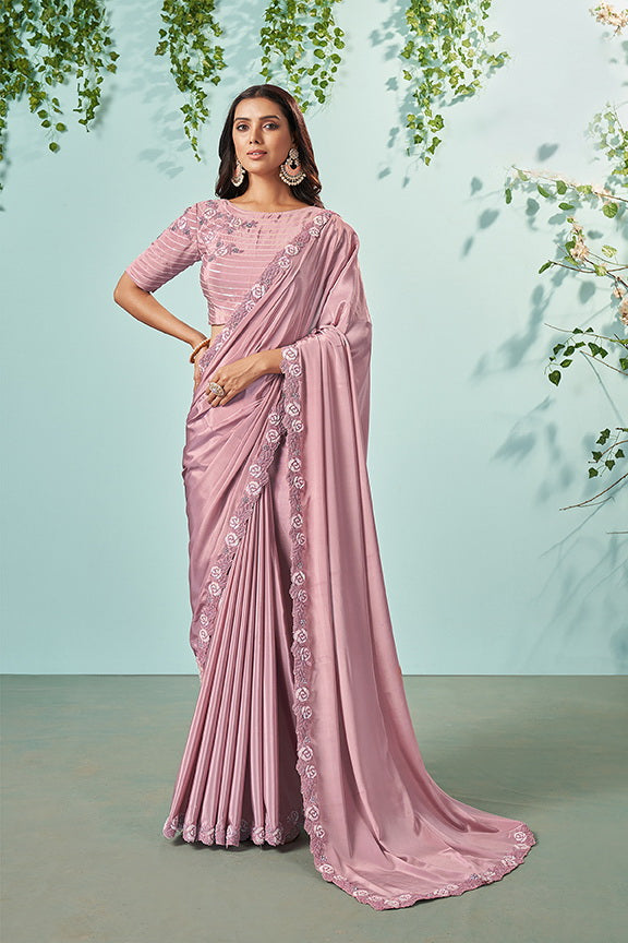 Pink Silk Crepe Embroidered Saree with Unstitched Blouse