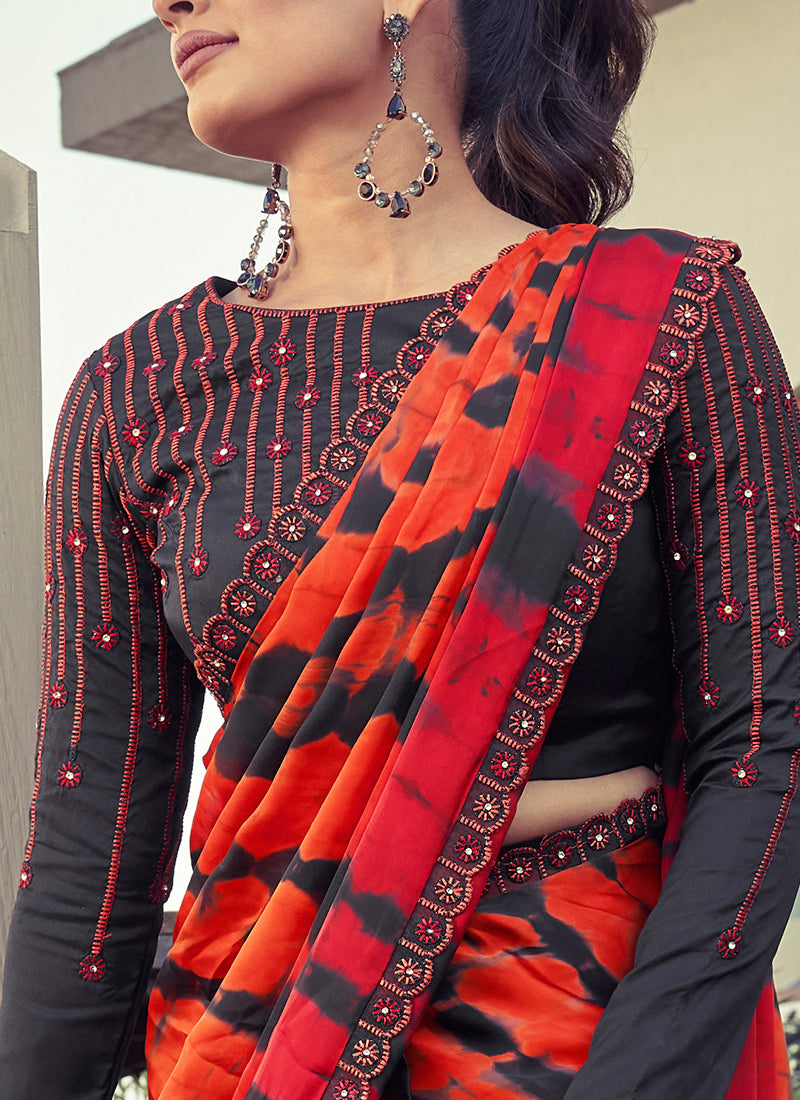 Orange Silk Satin Crepe Embroidered Ready to wear Saree with Stitched Blouse