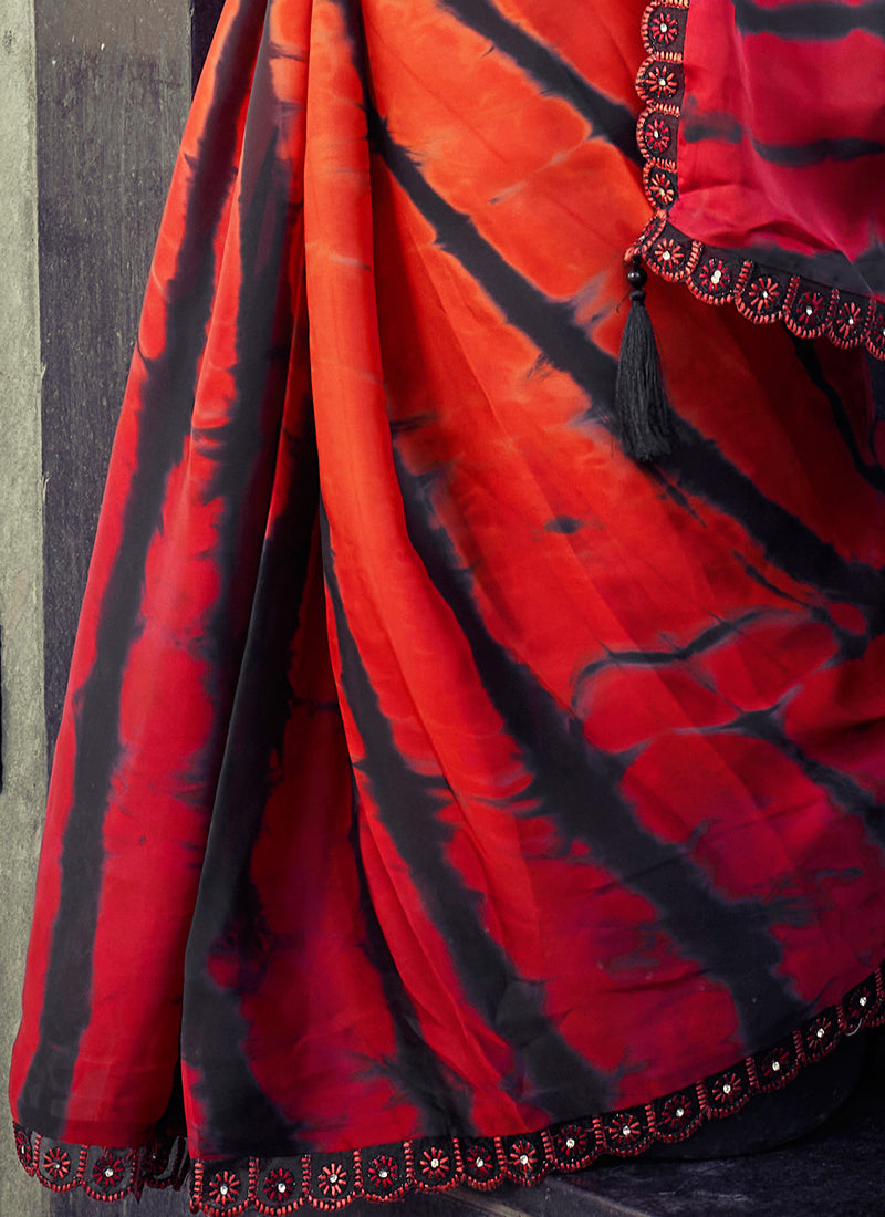 Work: Leheriya Printed Saree with Embroidered Lace Border