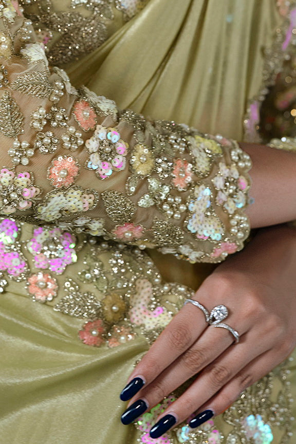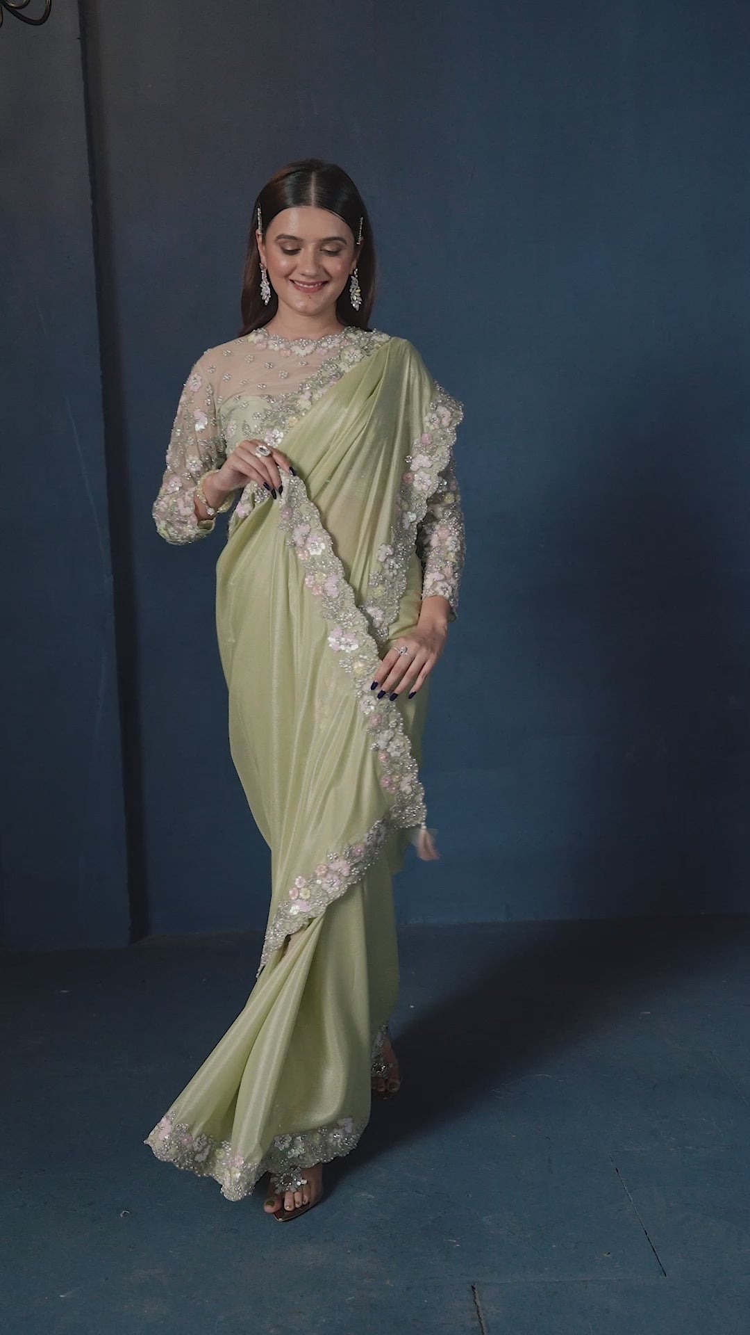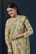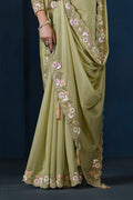 Green Crepe silk Embroidered with Stone work Saree with Unstitched Blouse