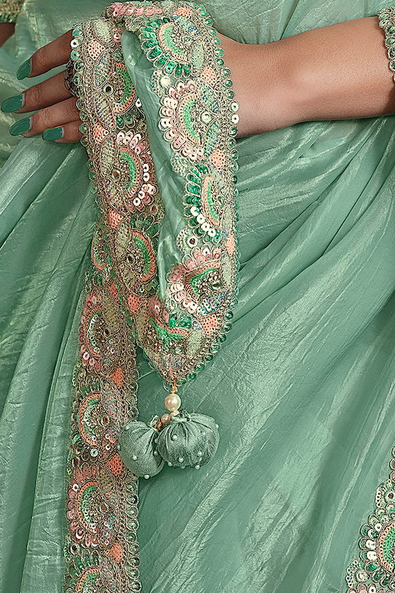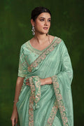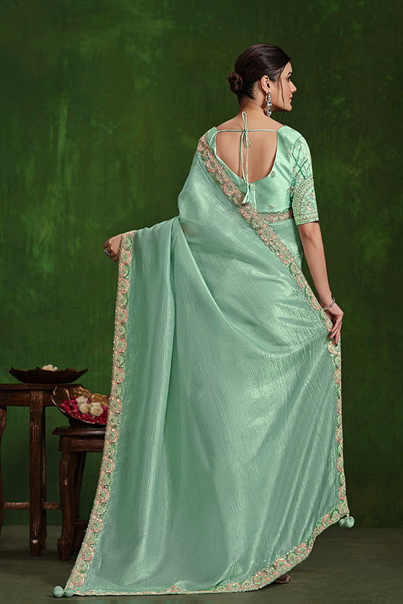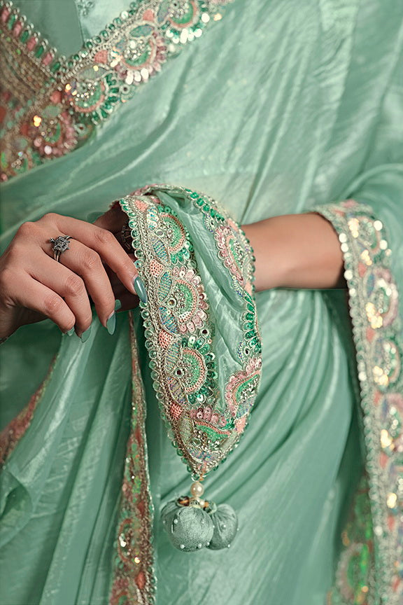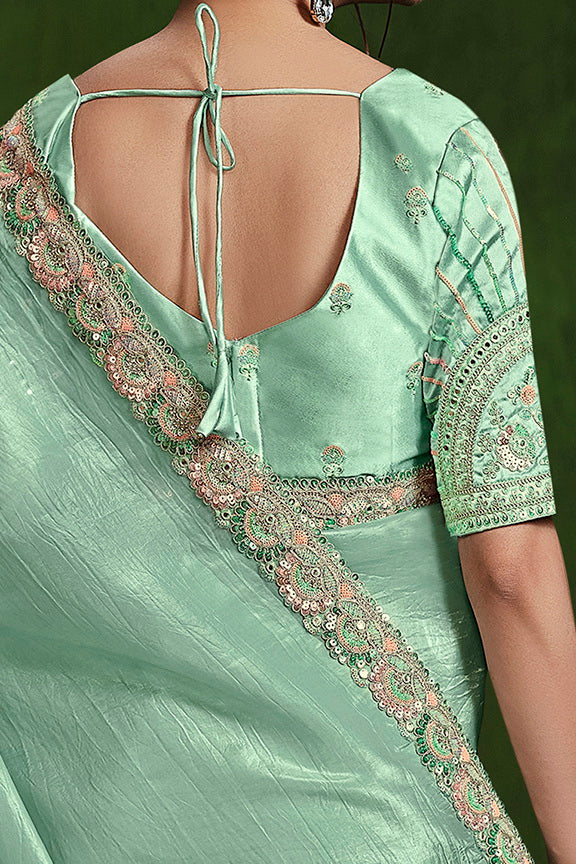 Aqua Blue Crush Paper Silk Sequence with Mirror work Saree with Stitched Blouse