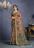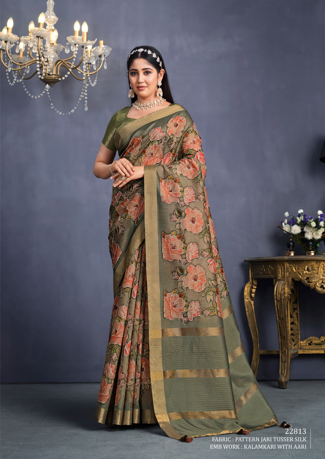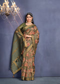 Green Jari Tusser Silk Aari Kalamkari Saree