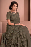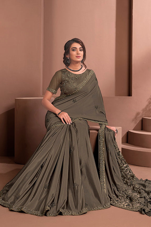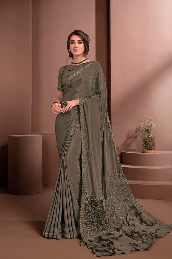 Brown Colored Crepe Embroidered Saree With Unstitched Blouse