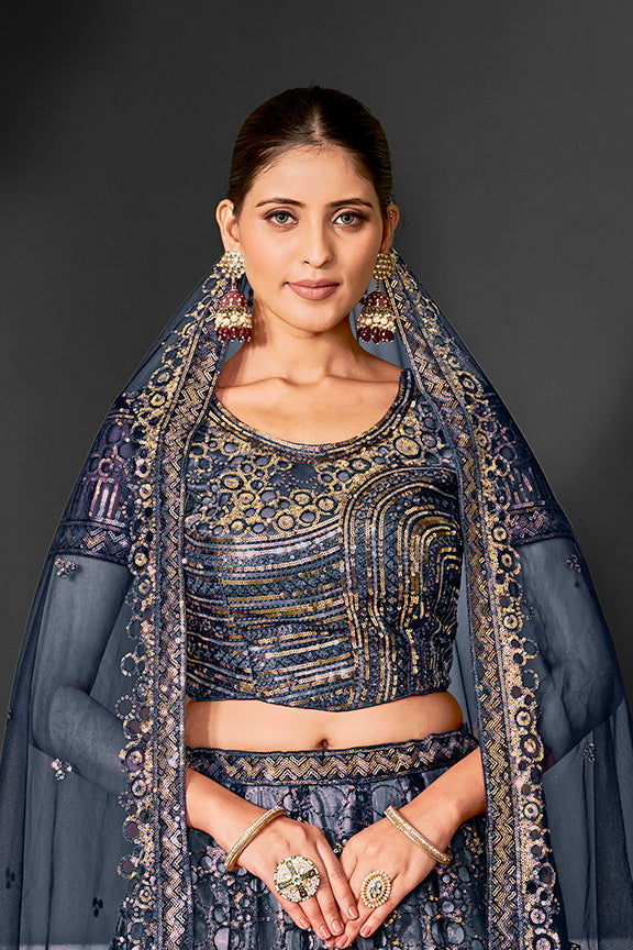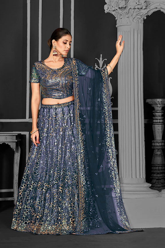 Blue Net Embroidered Semi Stitched Lehenga Choli