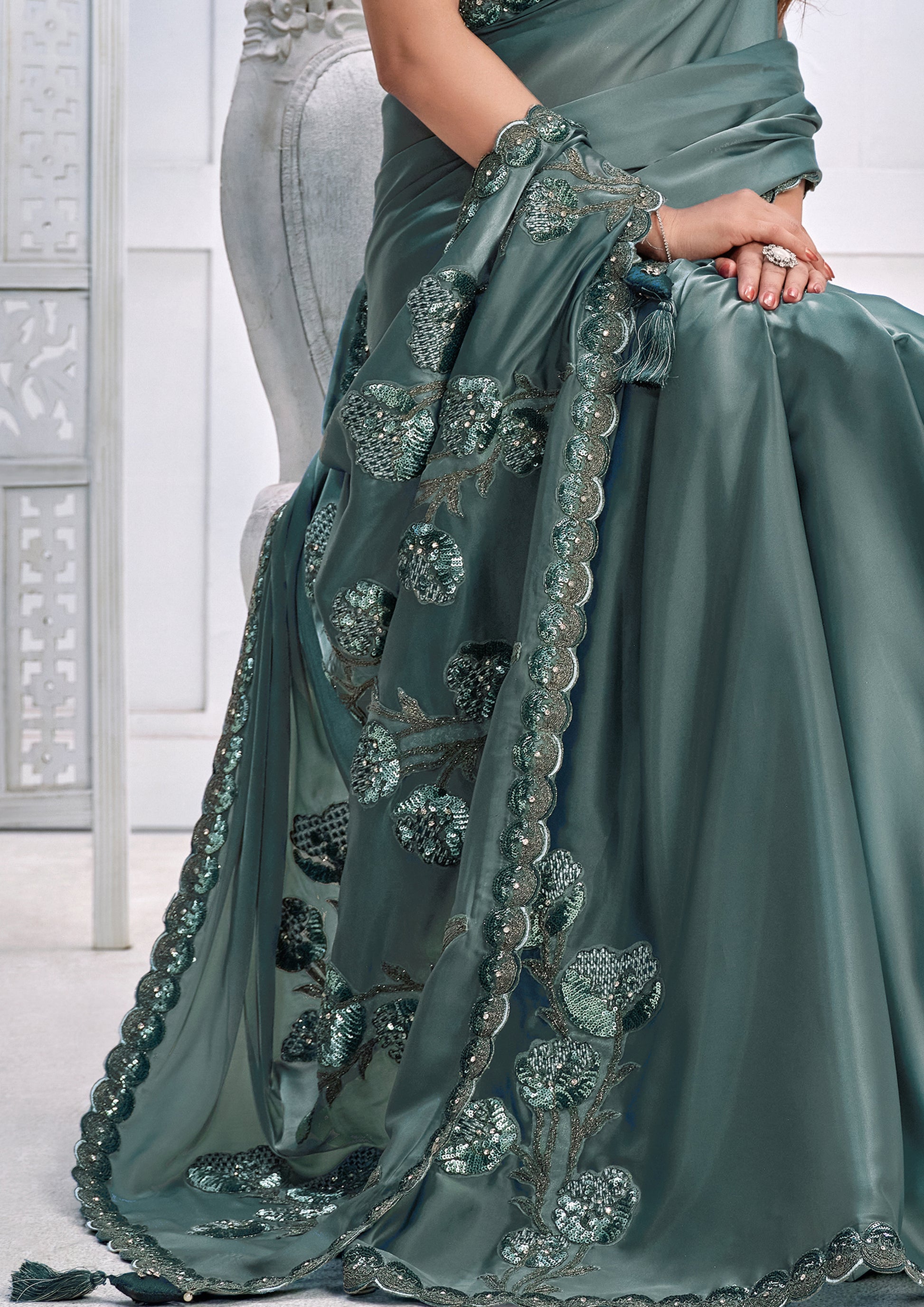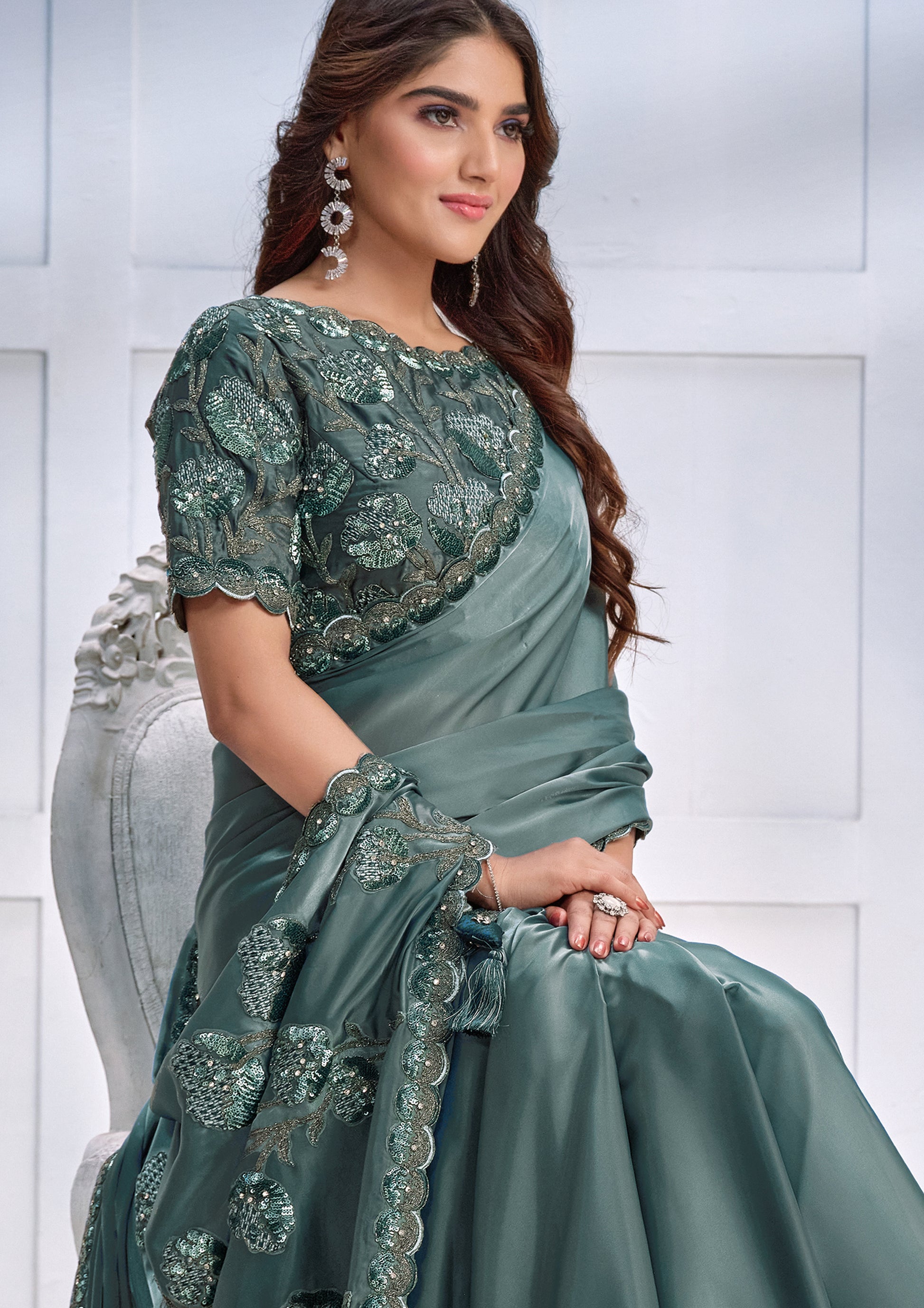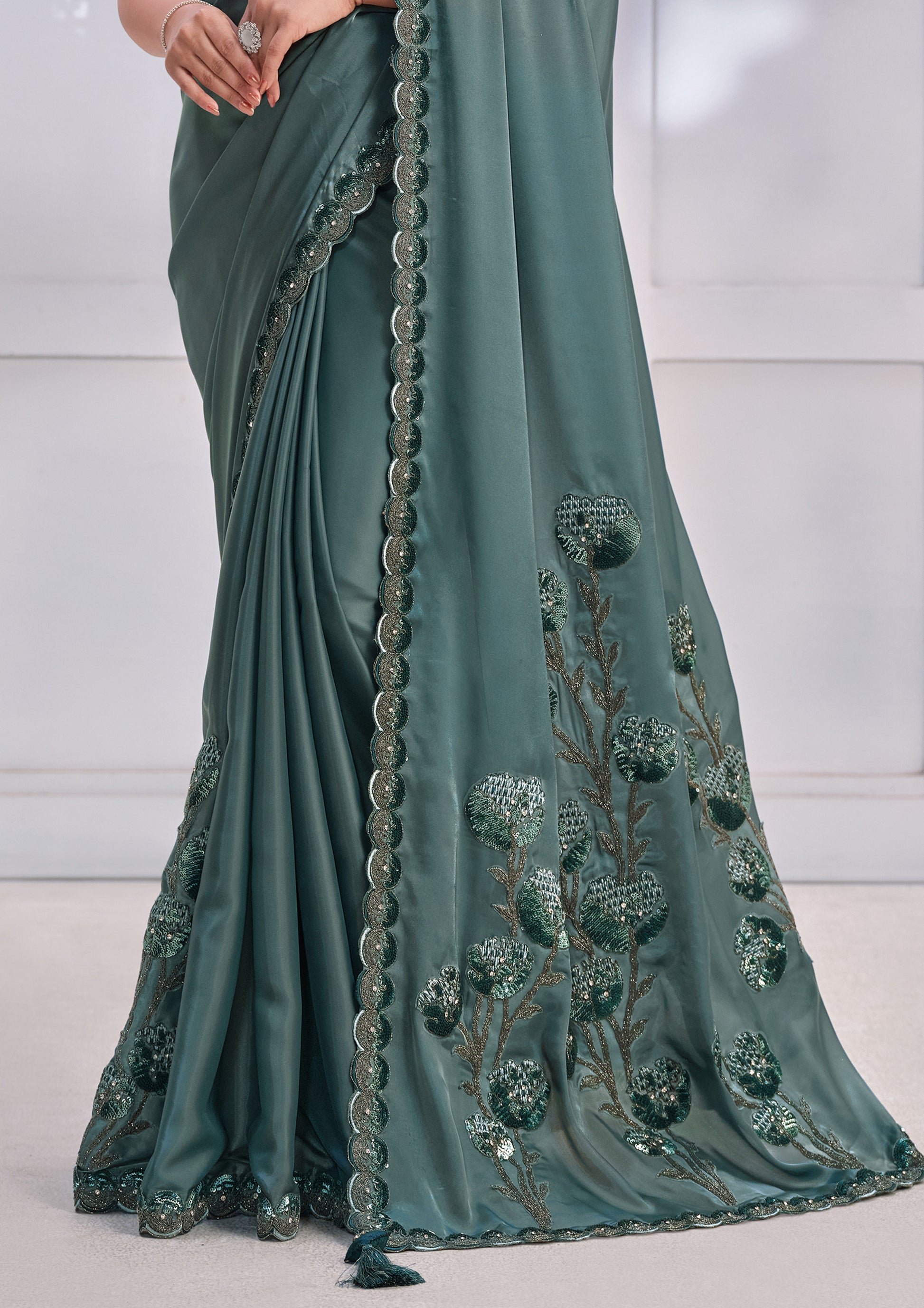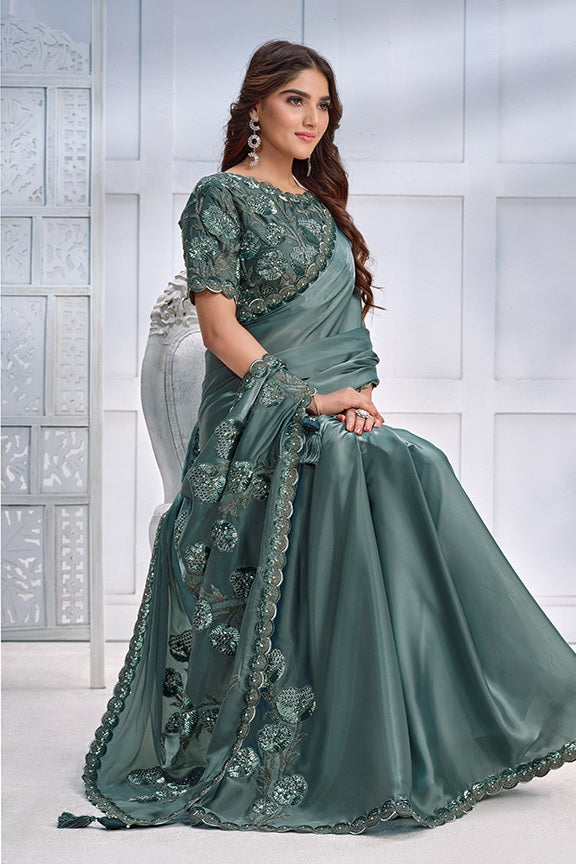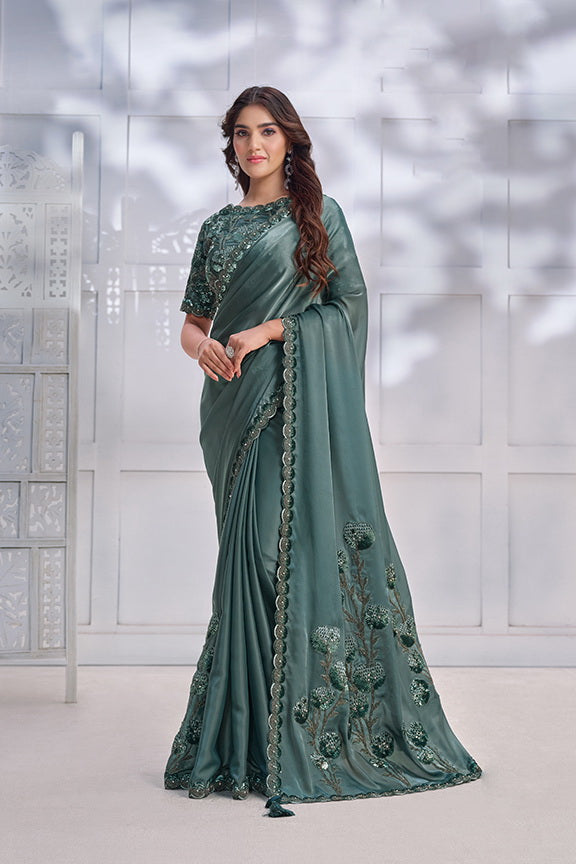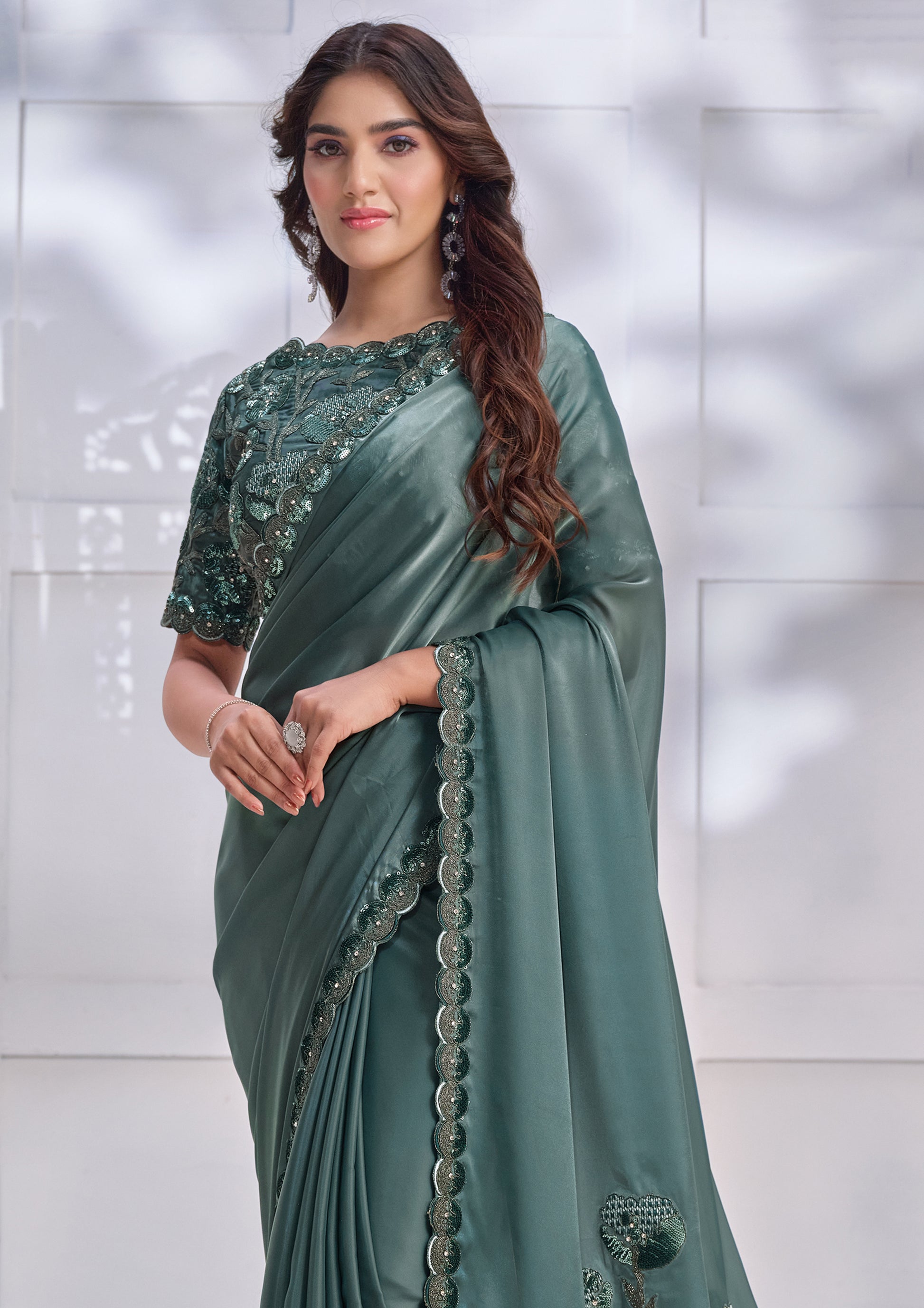 Green Satin Silk Embroidered Saree with Unstitched Blouse