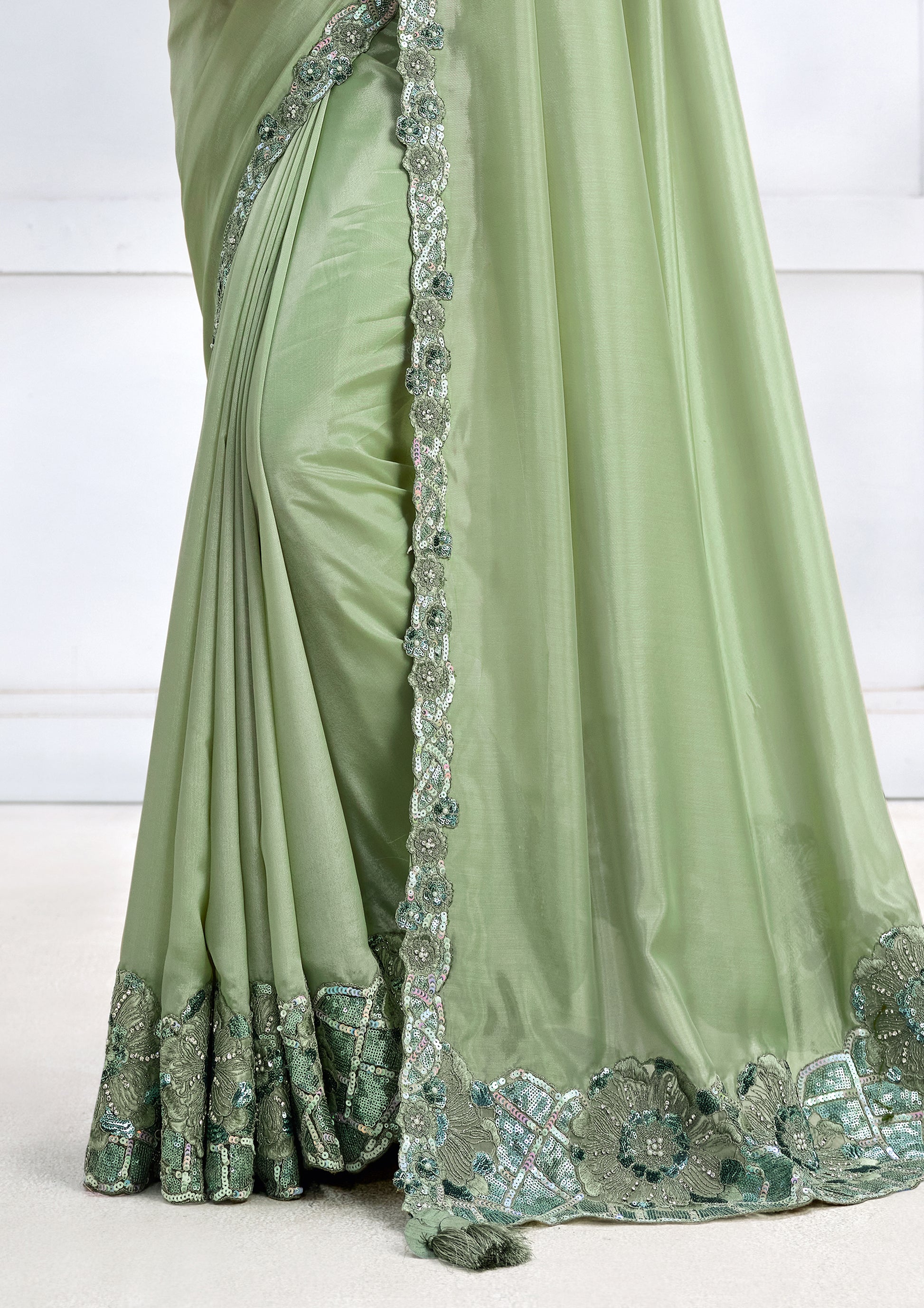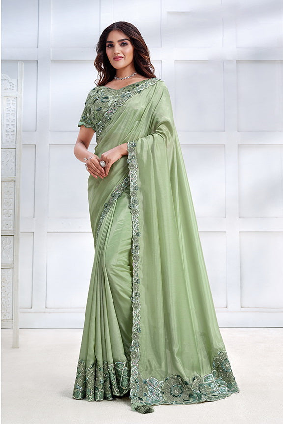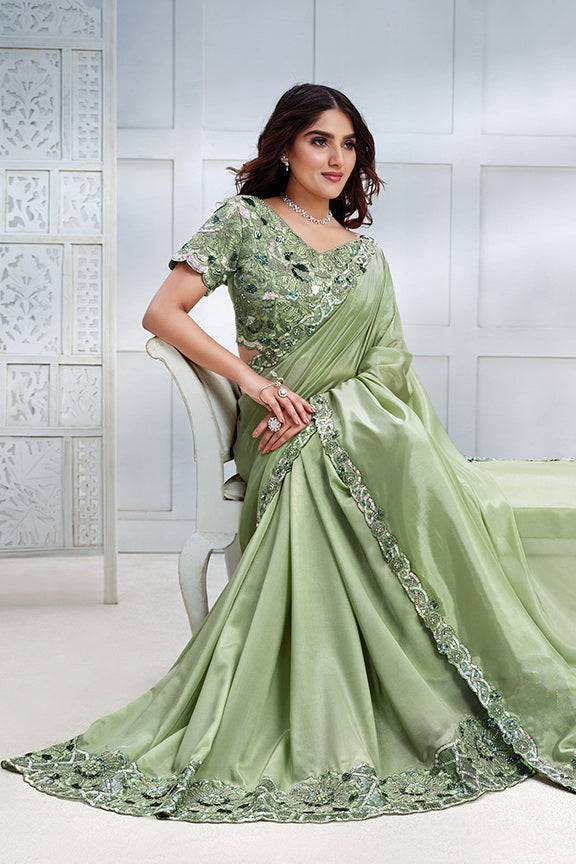 Green Tusser Silk Embroidered Saree with Unstitched Blouse