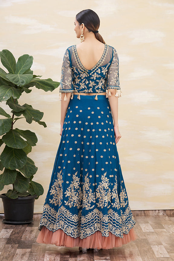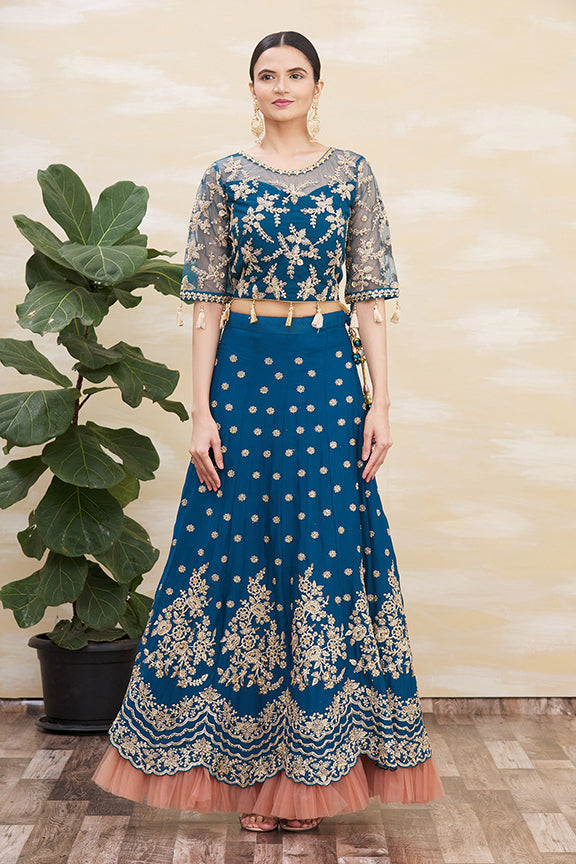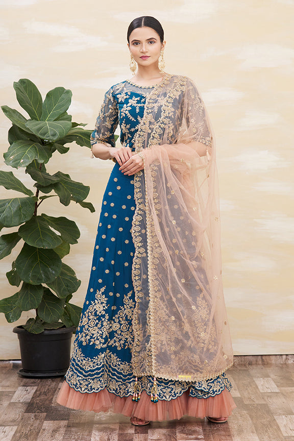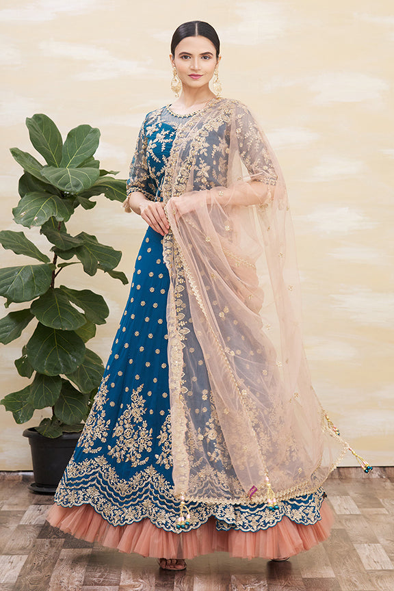 Teal Blue Satin Silk Embroidered Un-Stitched Lehenga Choli with Dupatta