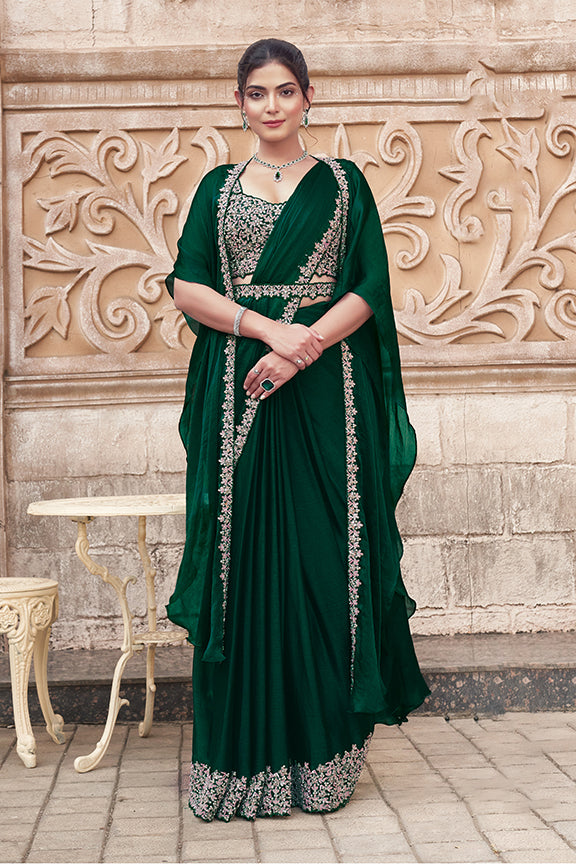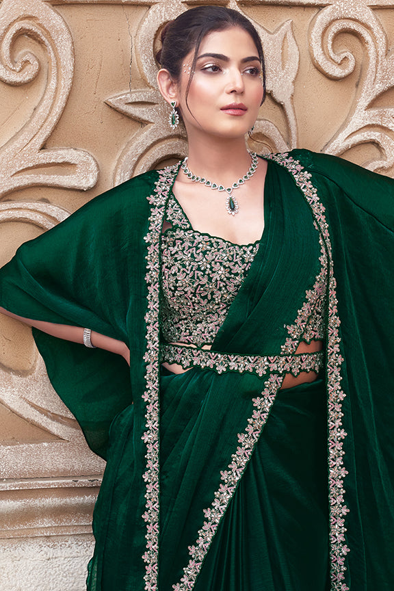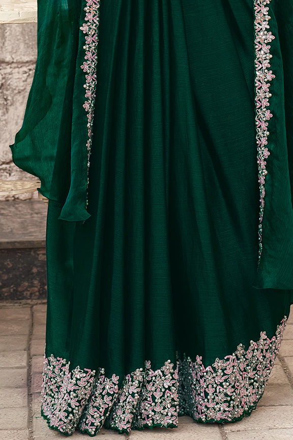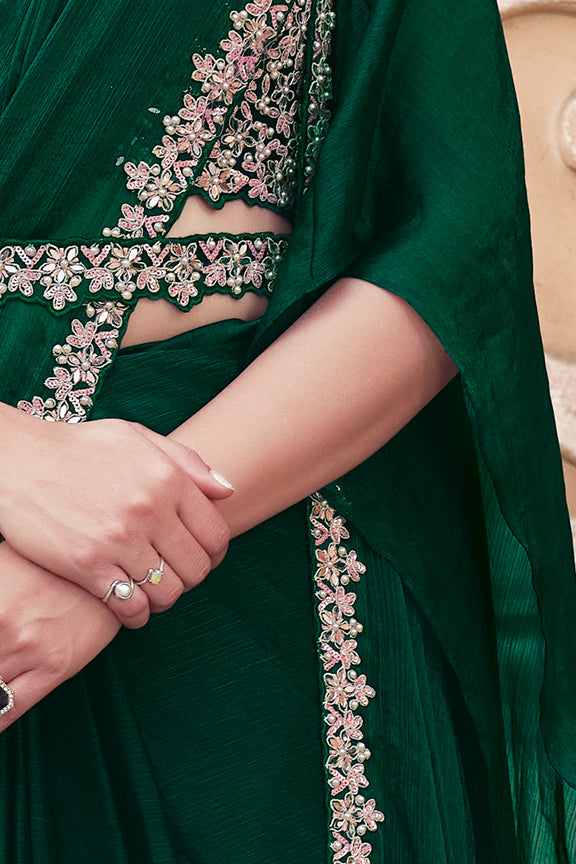 Green Shimmer Chiffon Hand Work Ready to wear saree