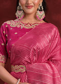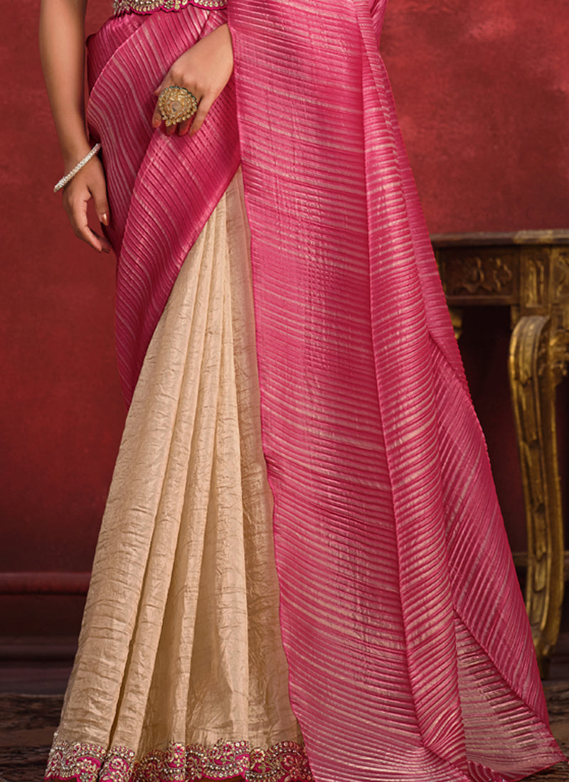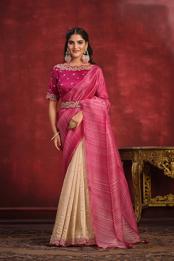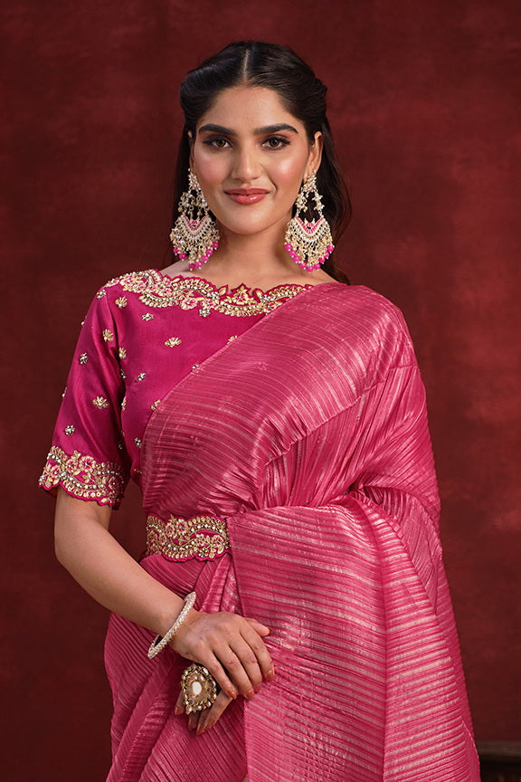 Pink Banarasi Crush Silk Texture Pallu Saree with Stitched Blouse