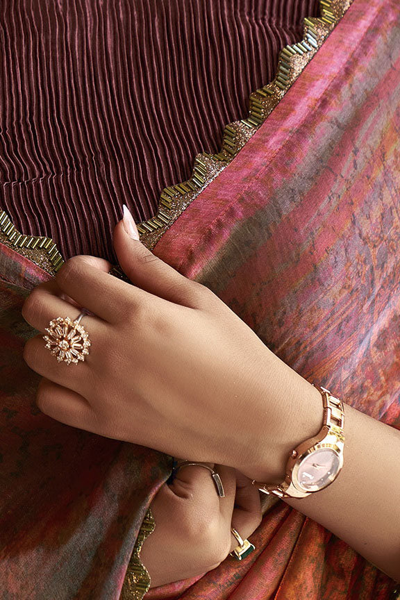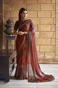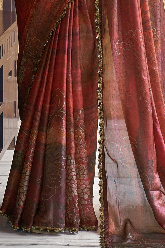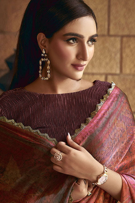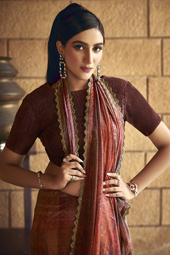 Brown Sparking Satin Silk Printed Saree with Unstitched Blouse