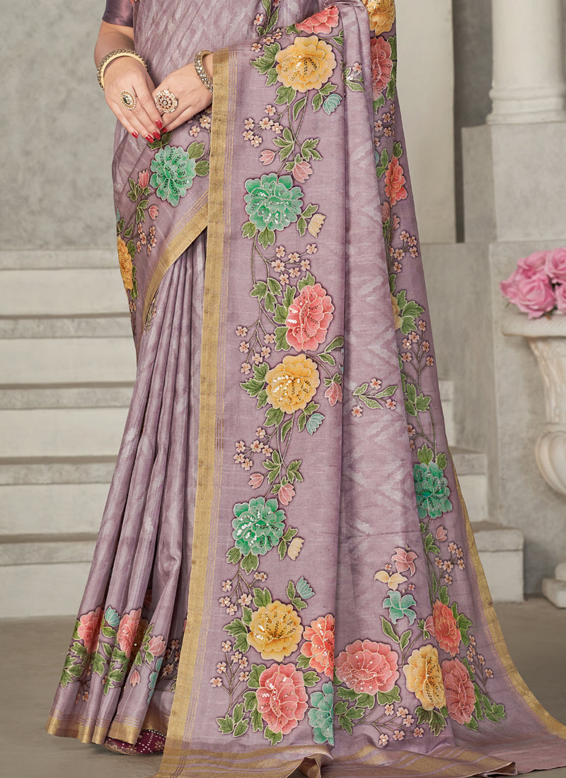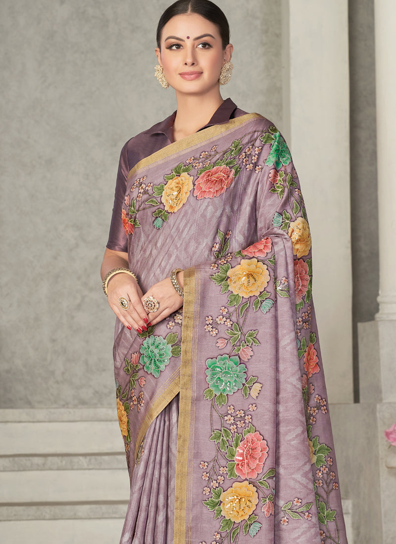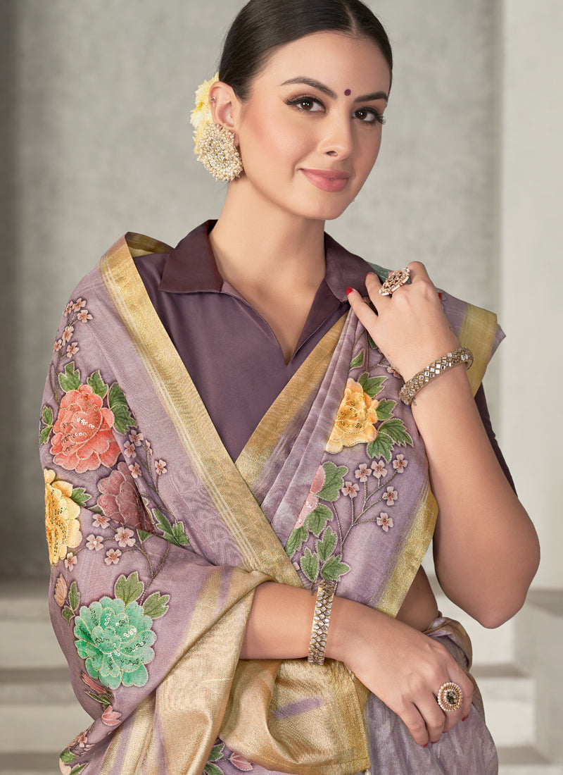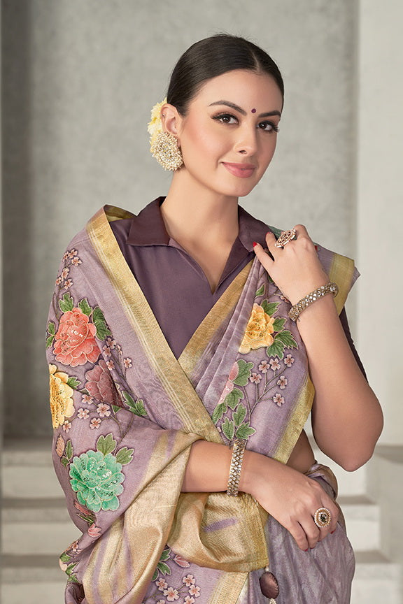 Purple Tussar Silk Embroidery Design Saree with Unstitched Blouse