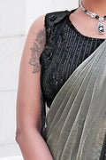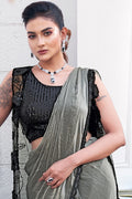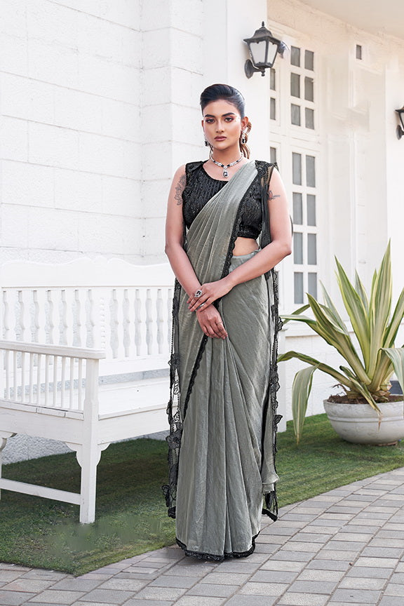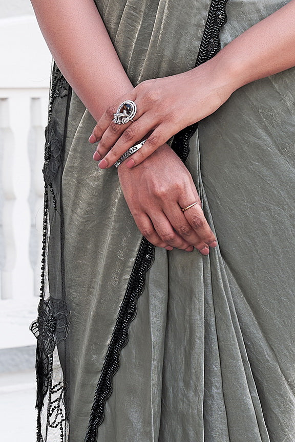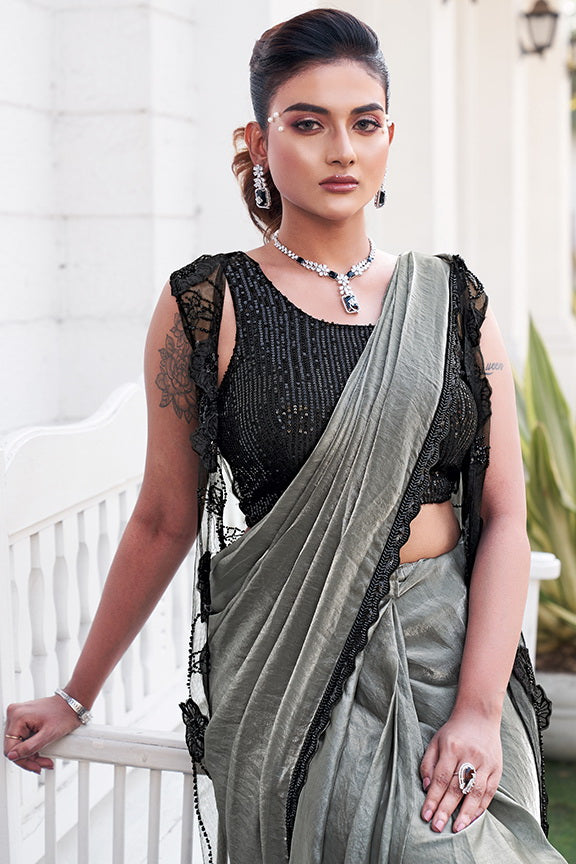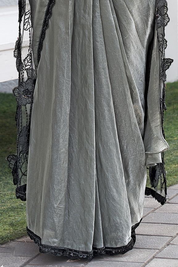 Dusty Grey Ombre Effect Satin Silk Pure Beads Handwork Ready to Wear Saree with Jacket and blouse.