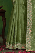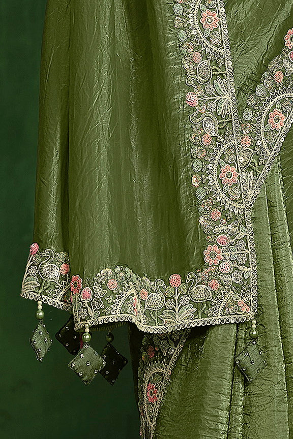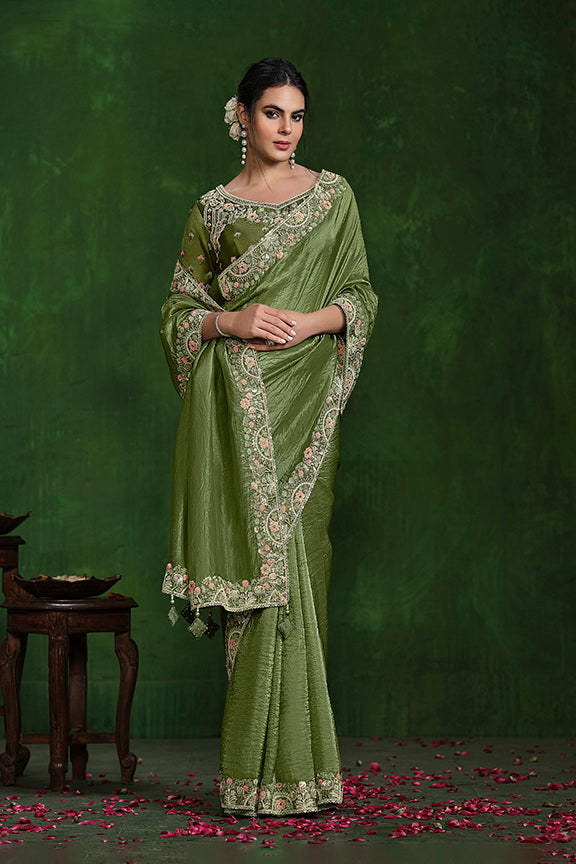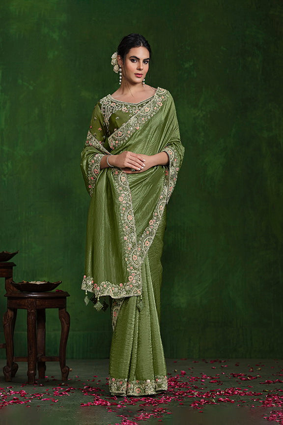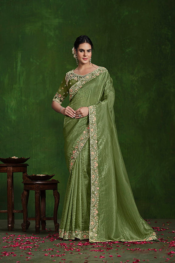 Green Crush Paper Silk Sequence with Diamond work Saree with Stitched Blouse