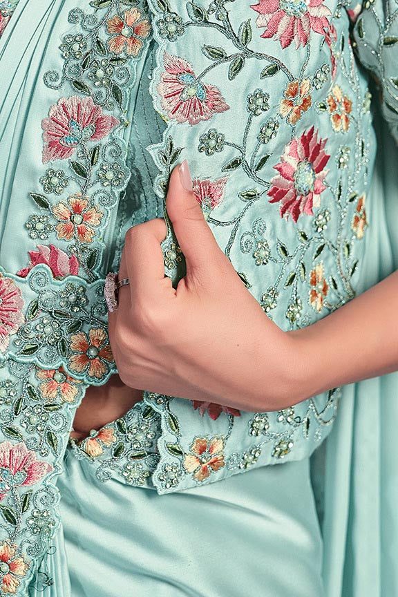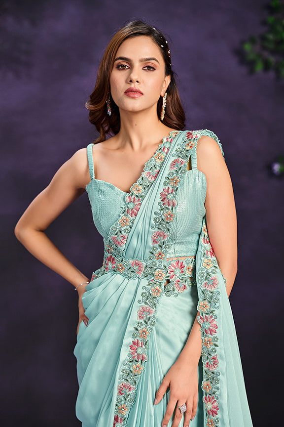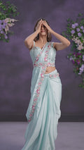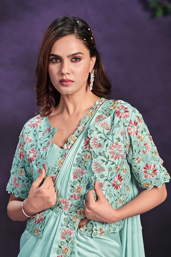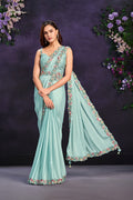 Aqua Blue Crepe Satin Silk Embroidered Ready to Wear Saree with Stitched Blouse
