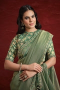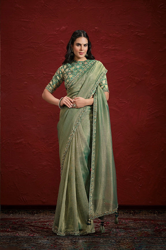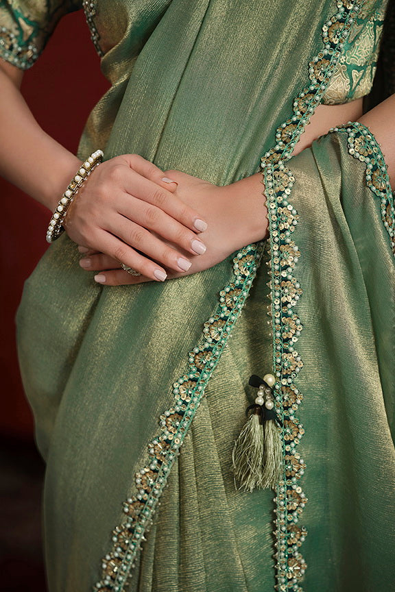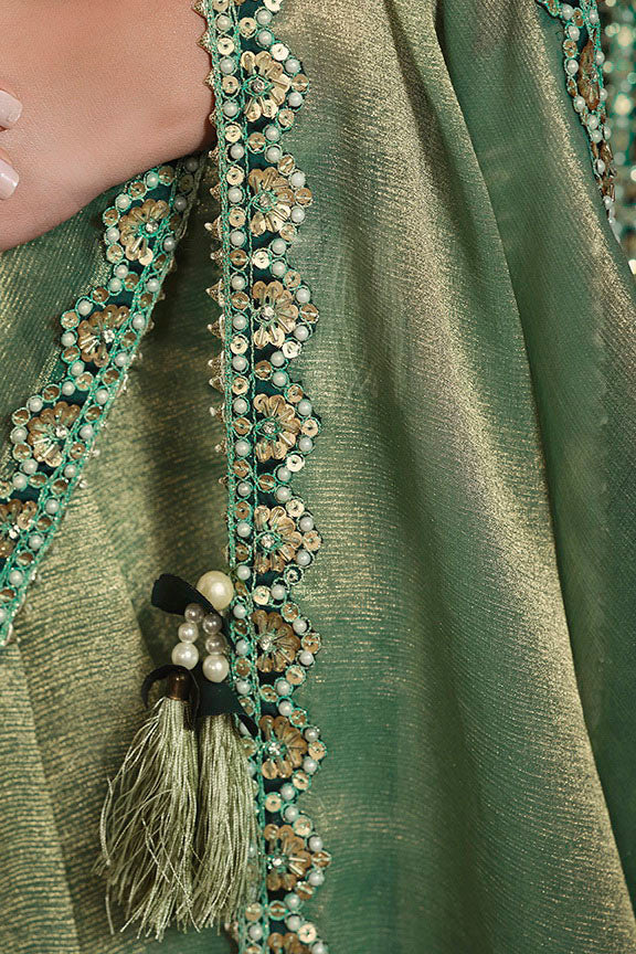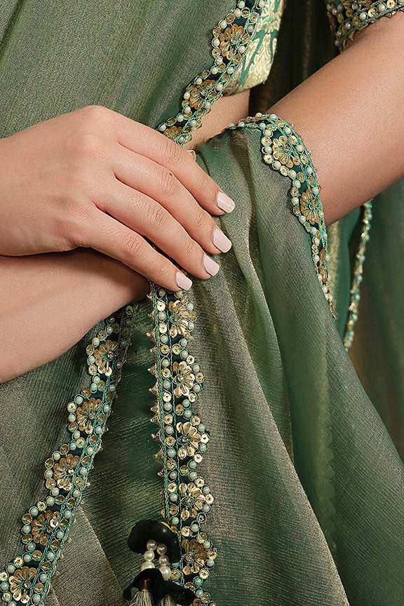 Green Pure Banarasi Jari pleat Sequence with Handwork Saree with Stitched Blouse