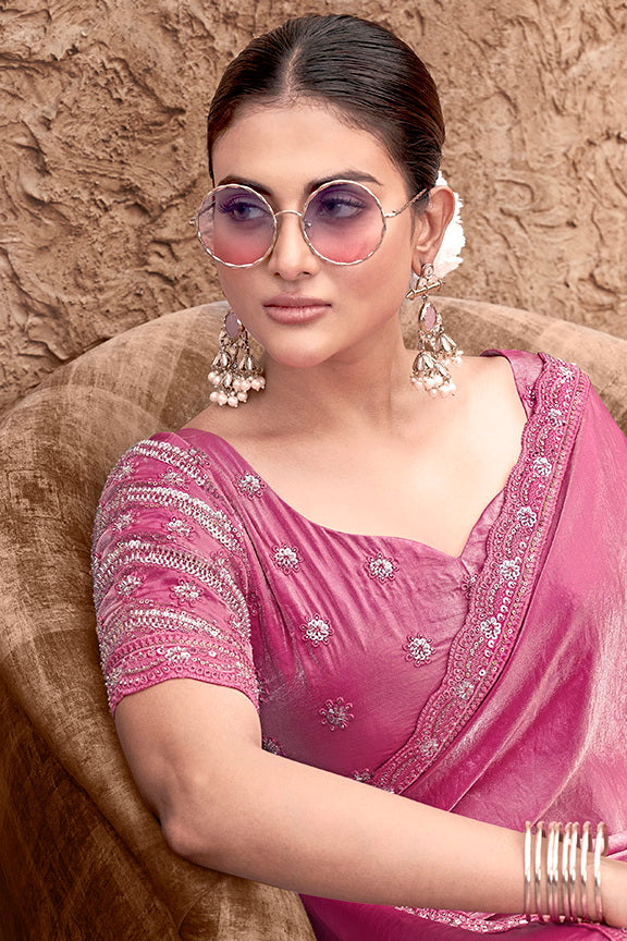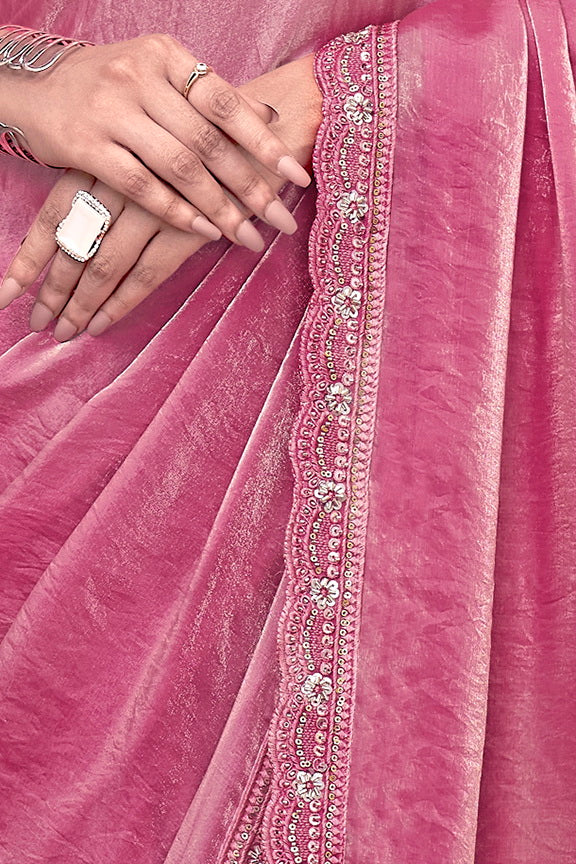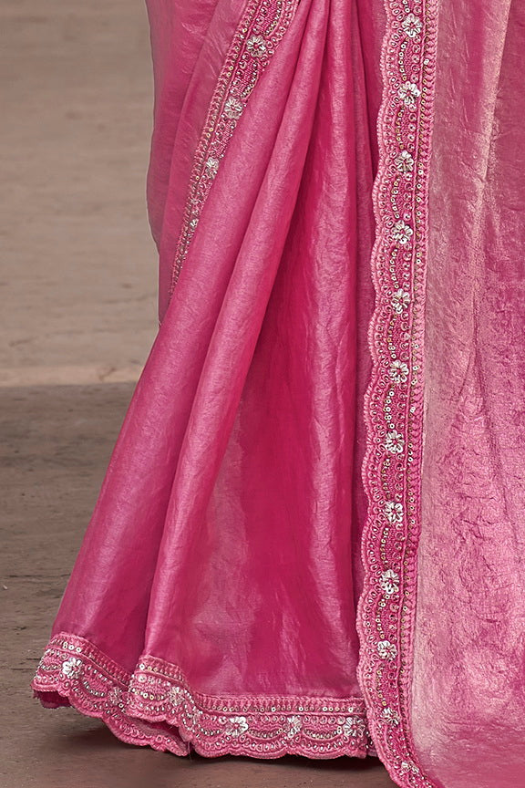 Gajari Gradient Satin Silk Artisanal Hand Embroidery Work Designer Saree with Stitched Blouse.
