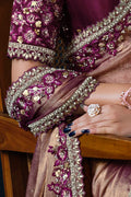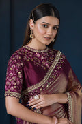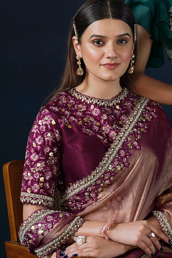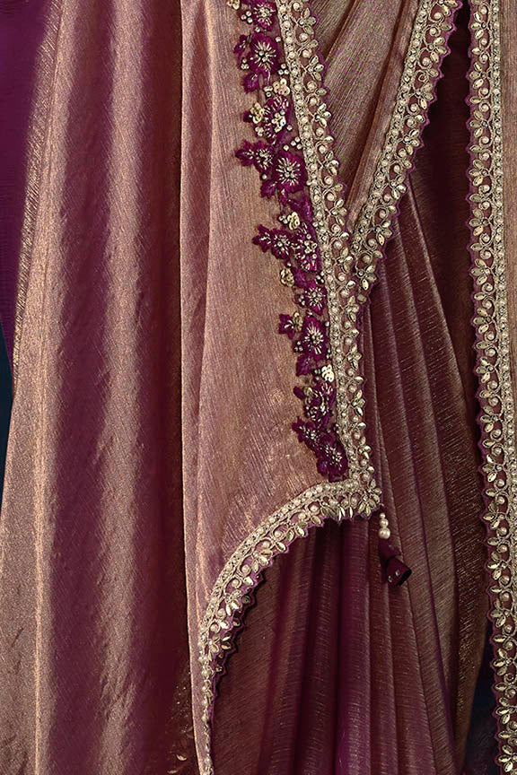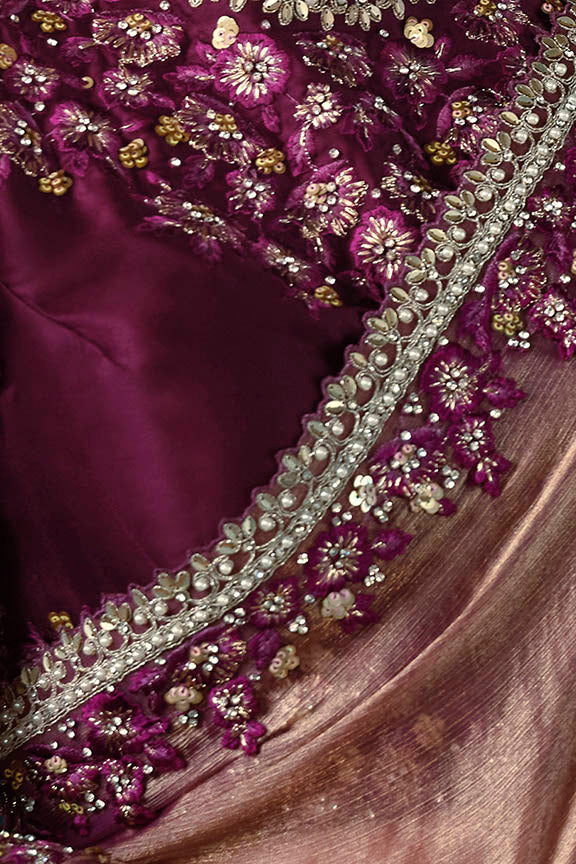 Magneta Crepe satin silk Jari work with Pure Handwork Saree with Unstitched Blouse