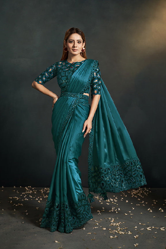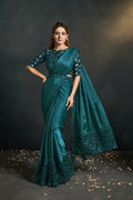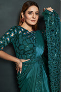 Green Crepe Satin Silk Ready to Wear Designer Saree with Stitched Blouse
