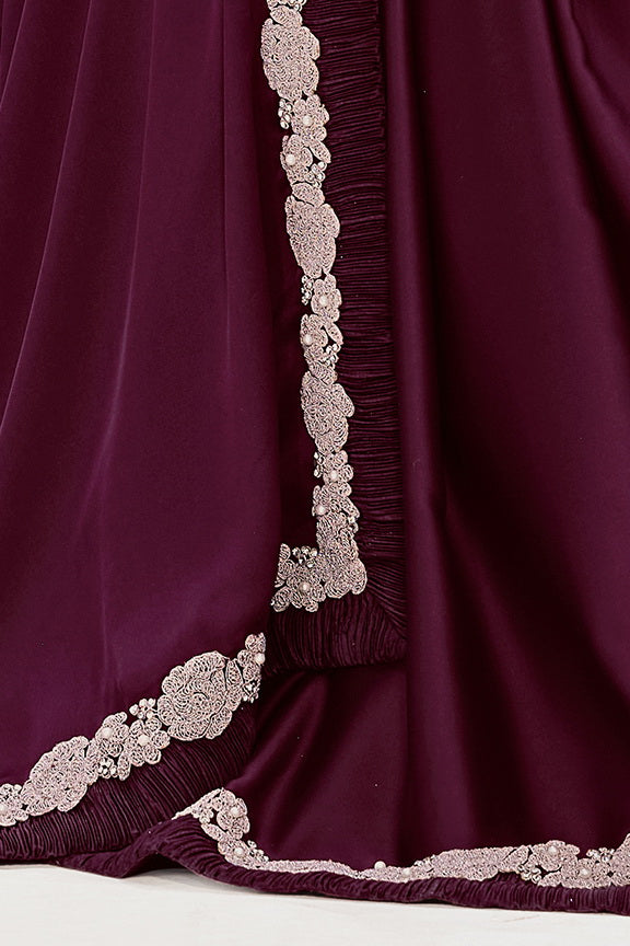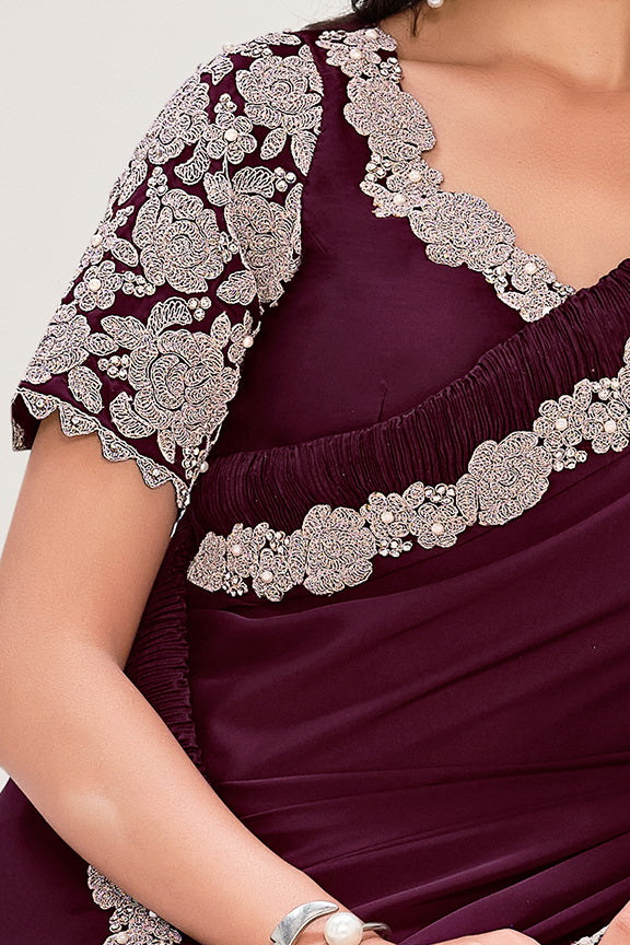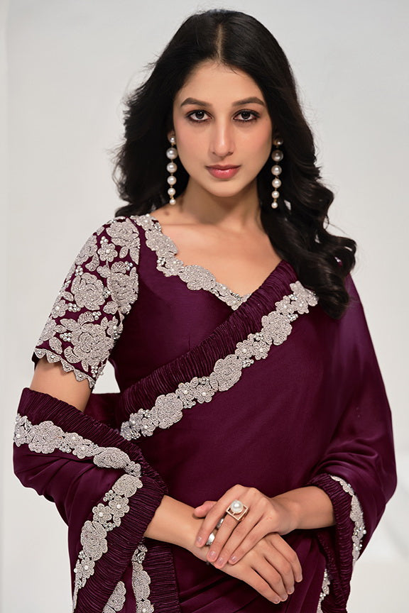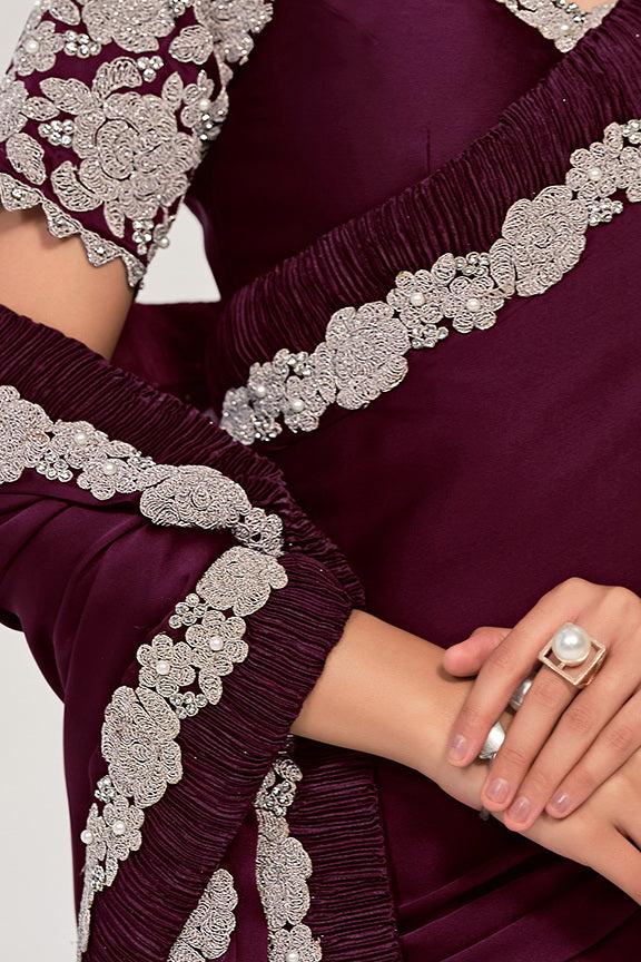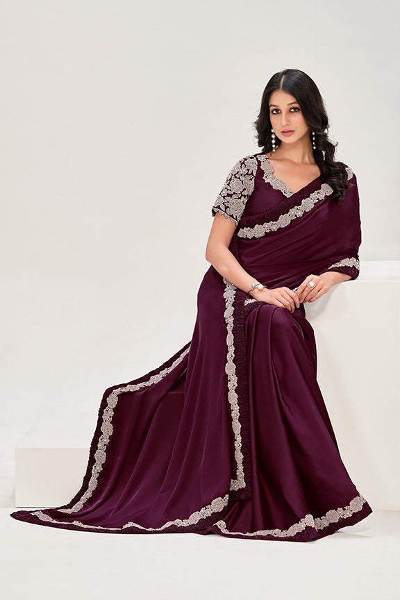 Wine Crepe Satin Silk Handwork Saree with Unstitched Blouse Piece