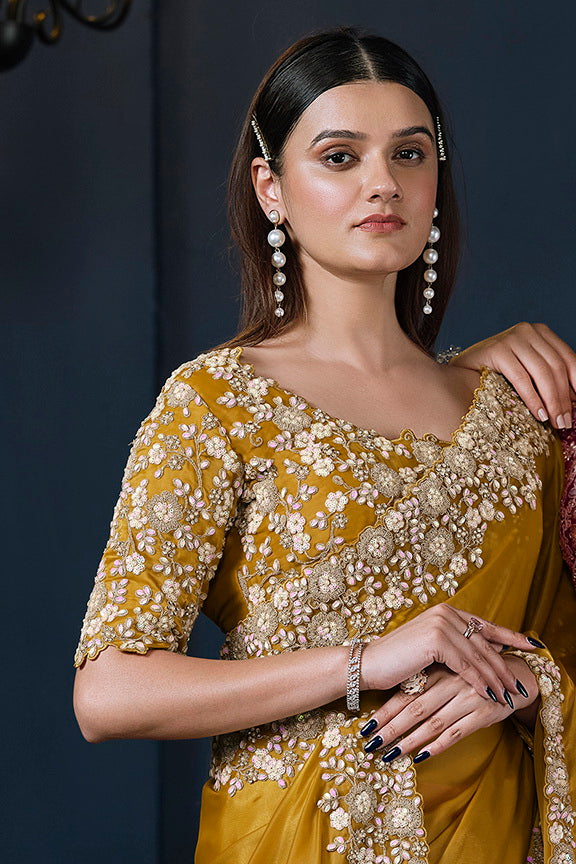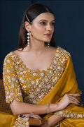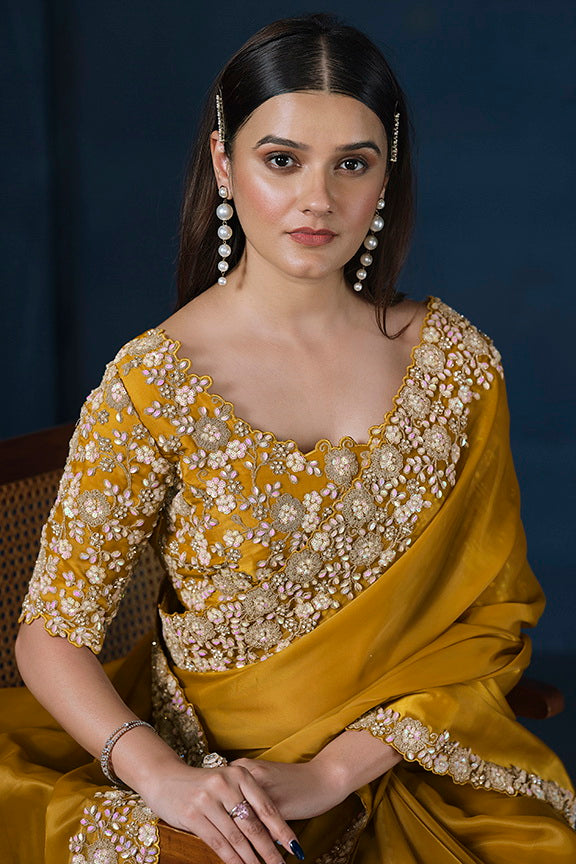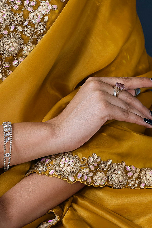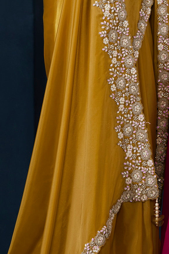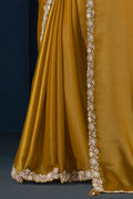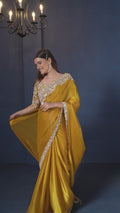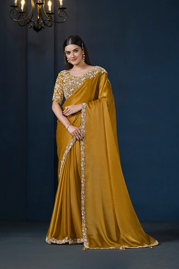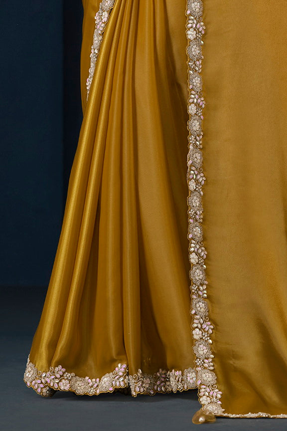 Mustard Crepe satin silk Daimond with Pure Handwork Saree with Unstitched Blouse