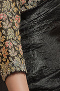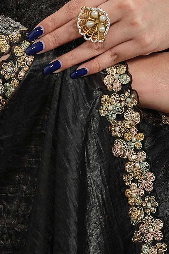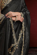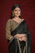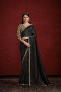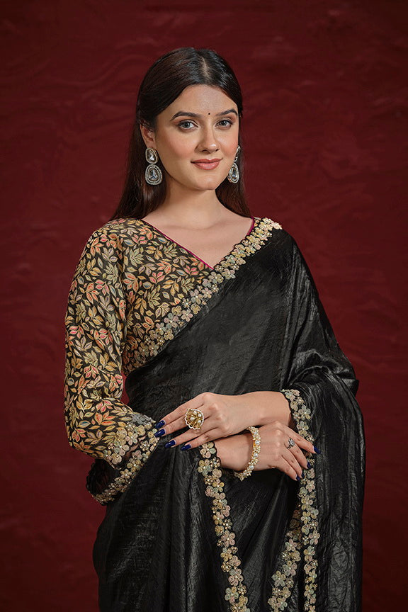 Black Crush Paper Silk Moti with Handwork Saree with Stitched Blouse