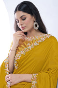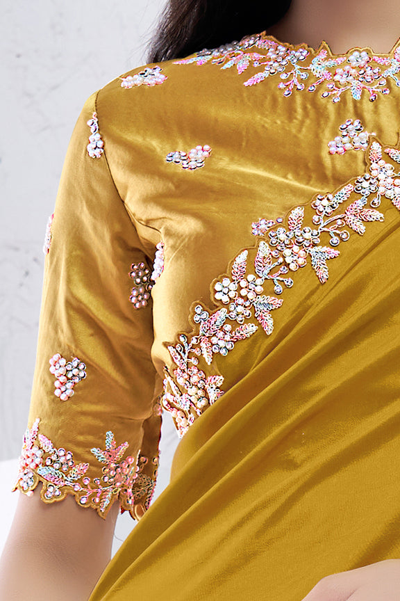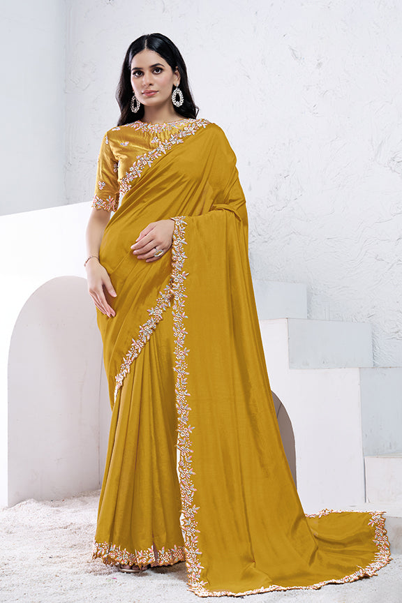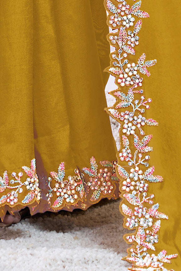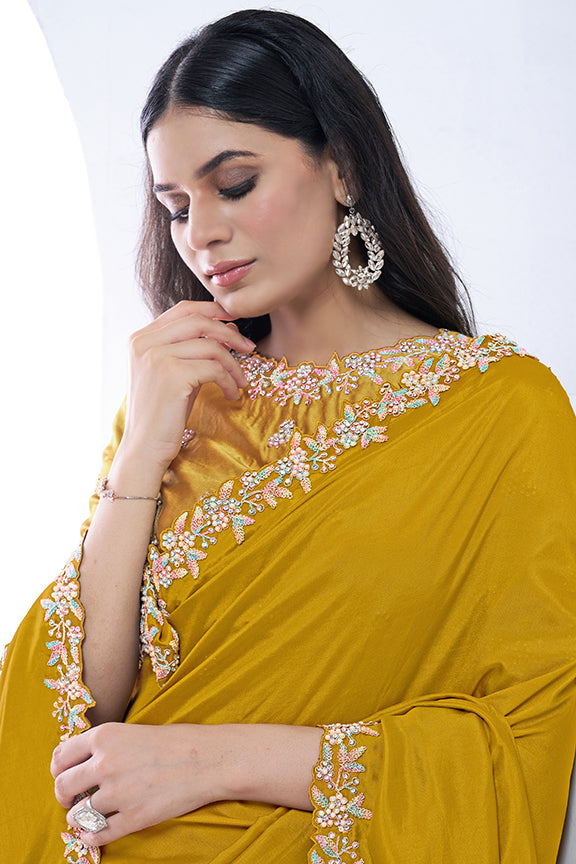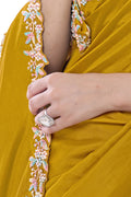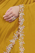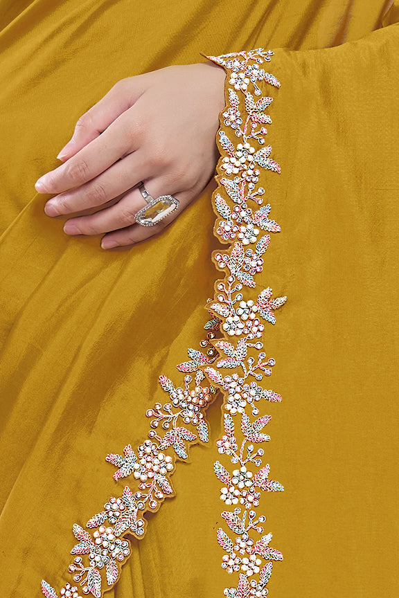 Mustard Pure Crepe Silk Moti with hand work Saree