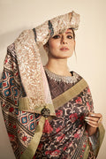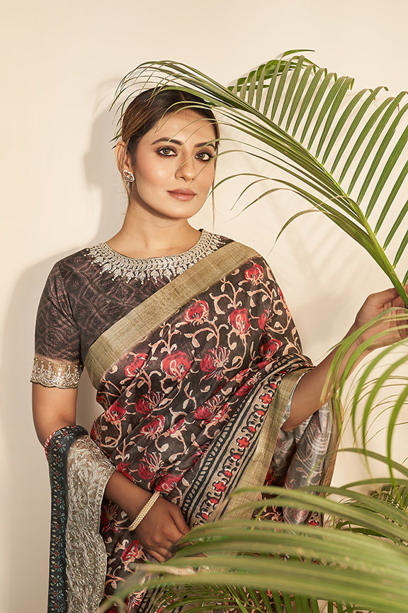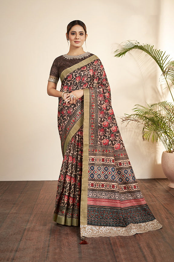 Brown Bhagalpuri Silk Floral Printed Saree with Unstitched Blouse
