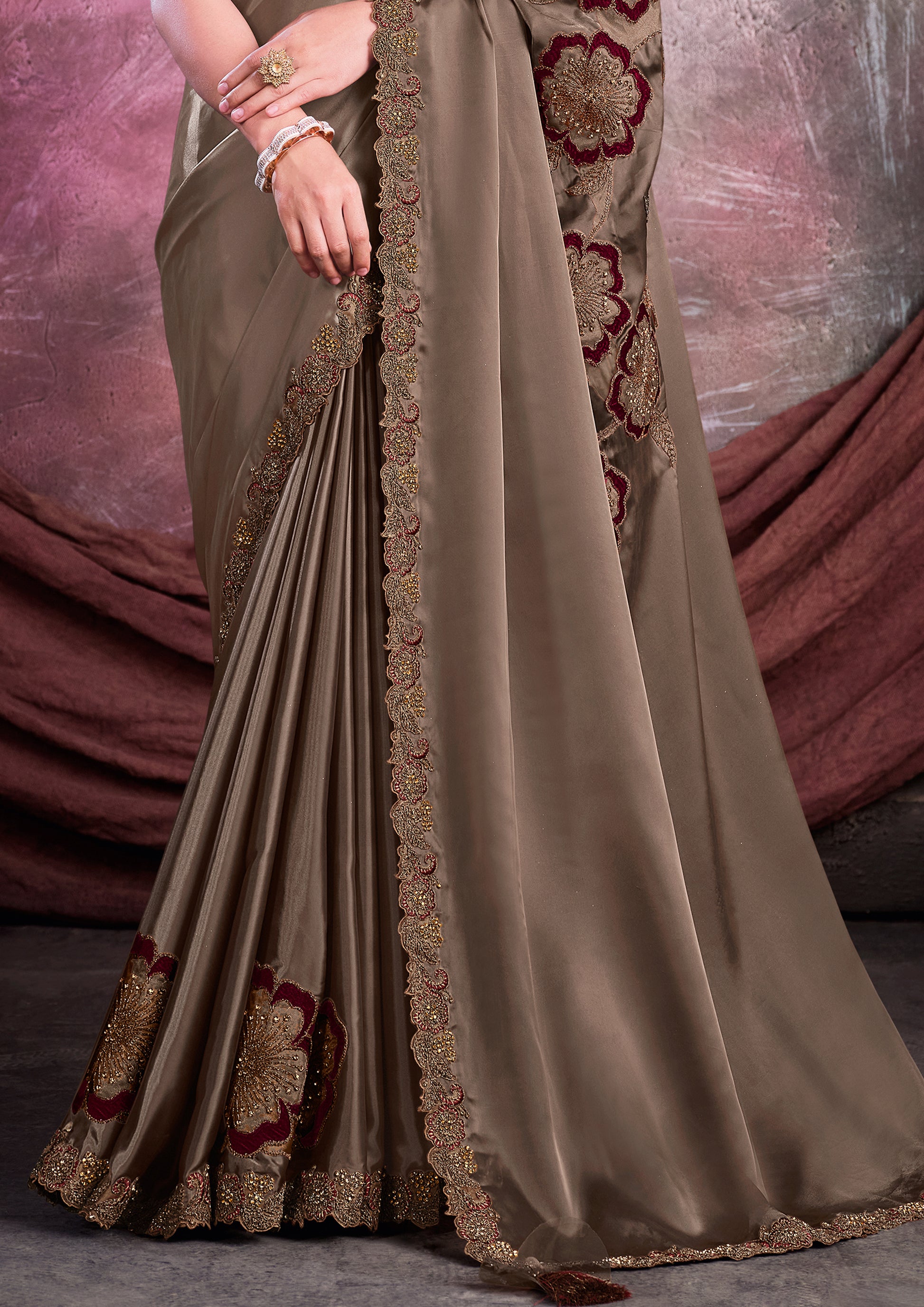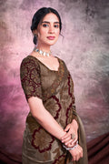 Brown Organza Crepe Silk Embroidered Saree with Unstitched Blouse