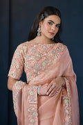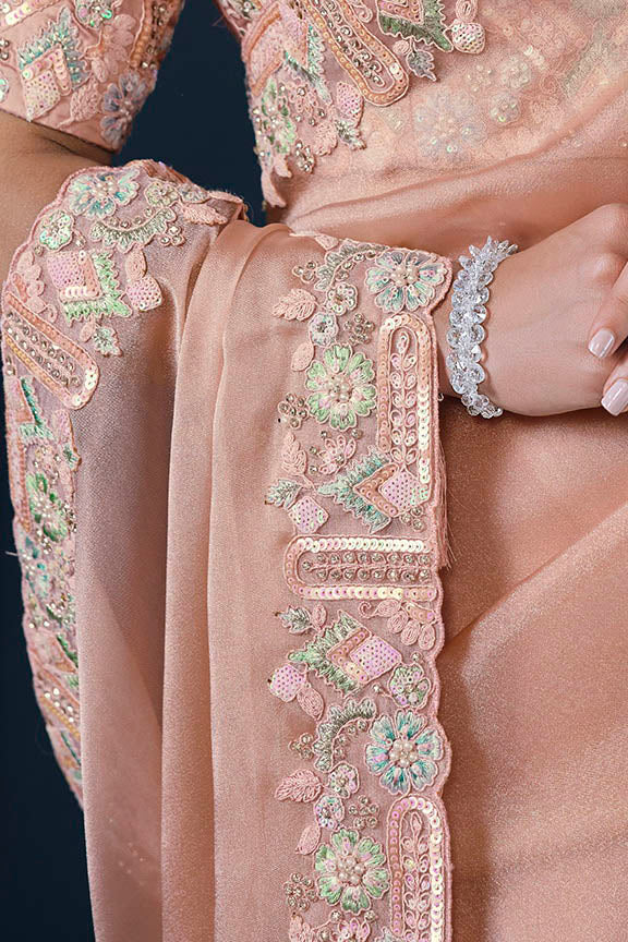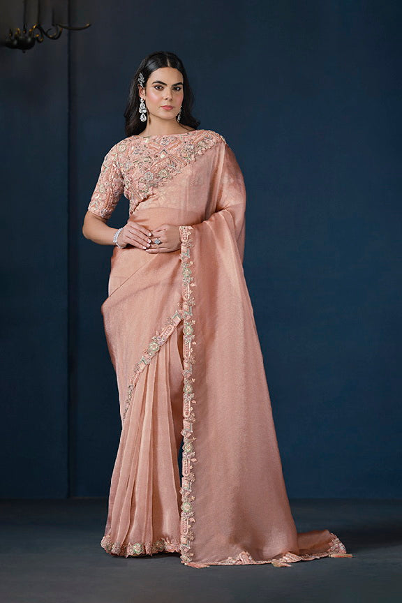 Peach Glace Tissue Sequins with Moti work Saree with Unstitched Blouse