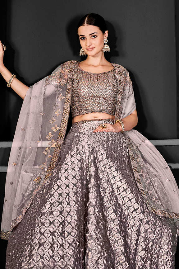 Grey Net Embroidered Semi Stitched Lehenga Choli