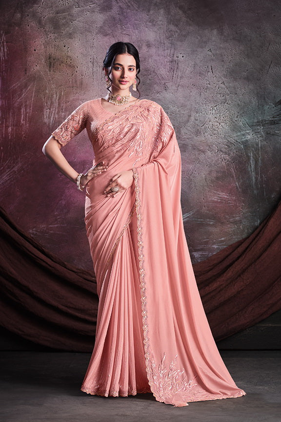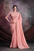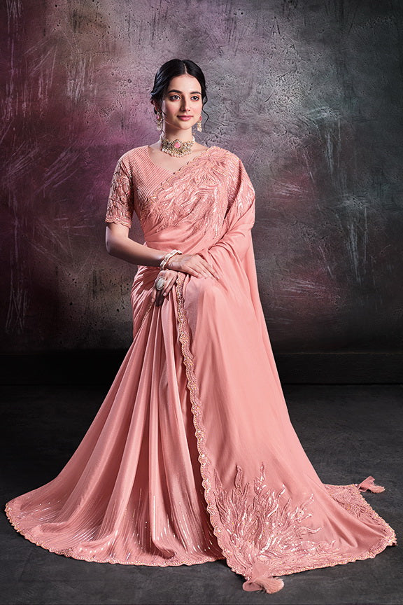 Peach Shimmer Crepe Silk Embroidered Saree with Unstitched Blouse