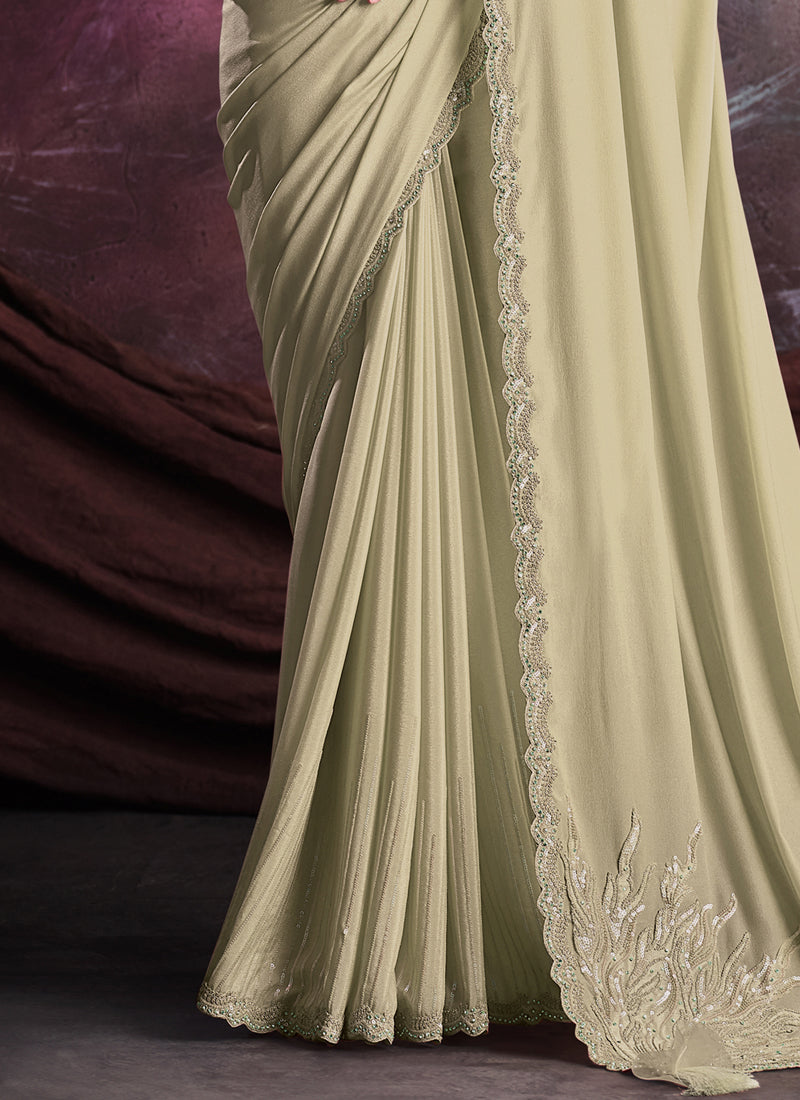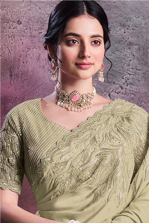 Green Shimmer Crepe Silk Embroidered Saree with Unstitched Blouse