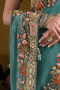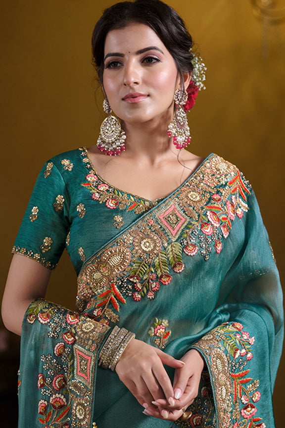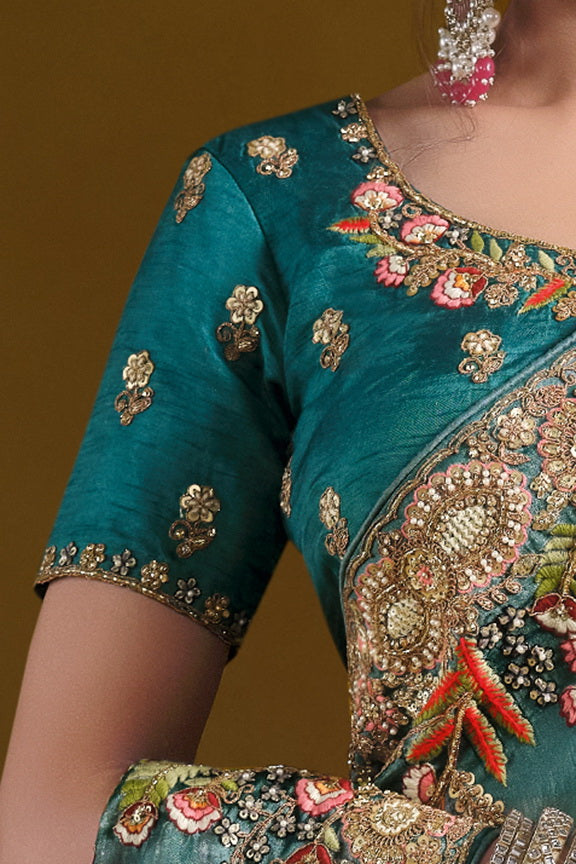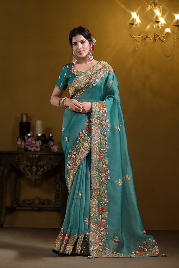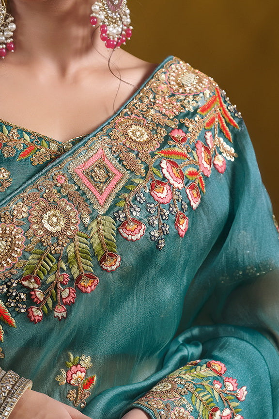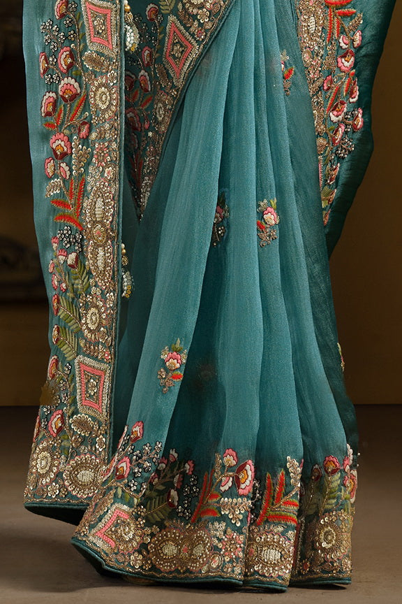 Teal Blue Pure Twill Tissue Pure Khatli work Designer Saree With Blouse.