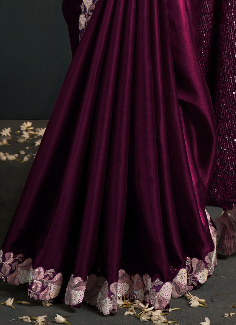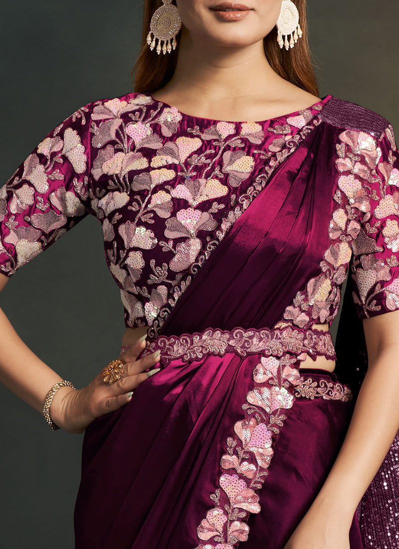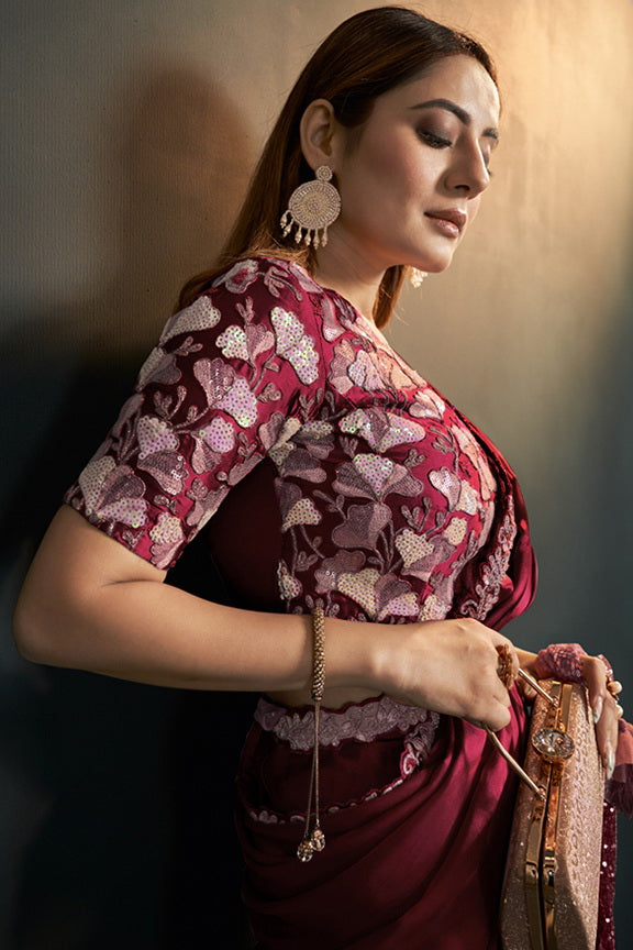 Maroon Satin Silk Ready to Wear Designer Saree with Stitched Blouse