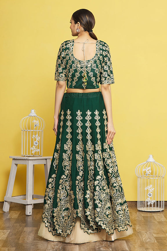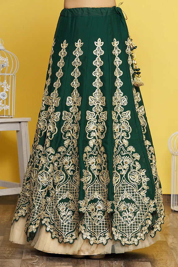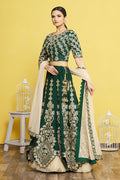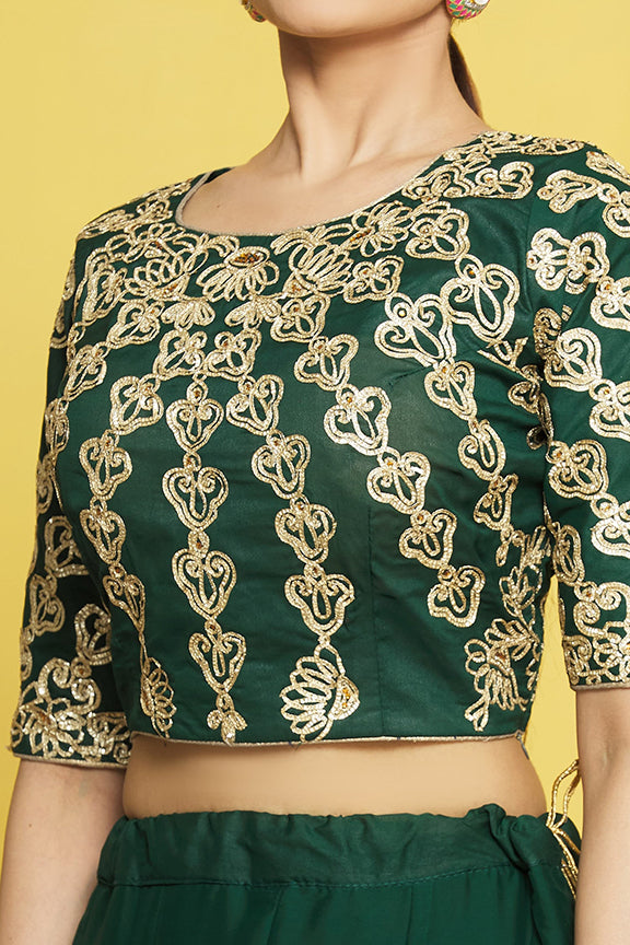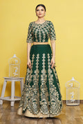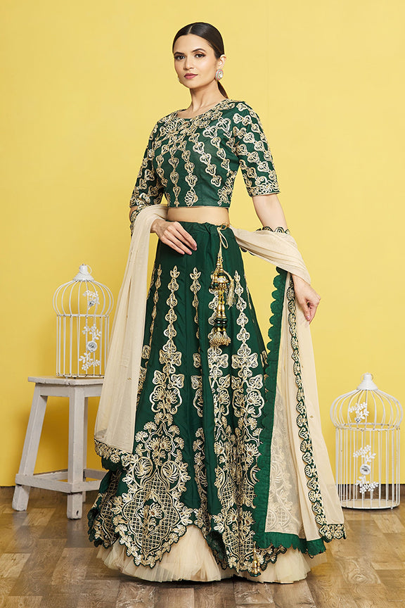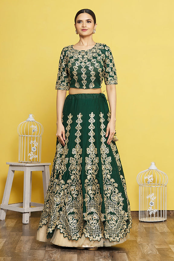 Green Satin Silk Embroidered Un-Stitched Lehenga Choli with Dupatta