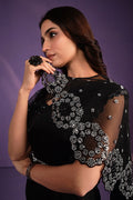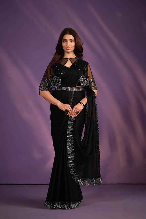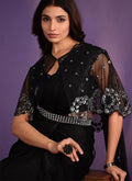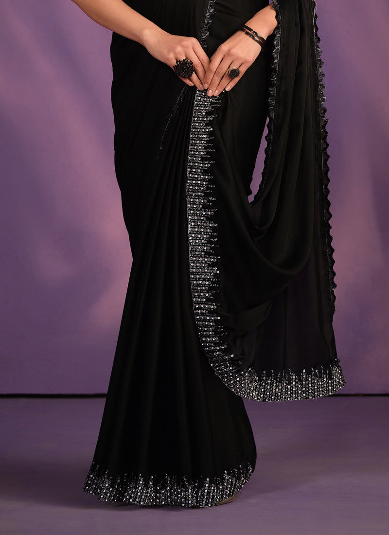 Black Satin Silk Embroidered Ready to wear Saree with Stitched Blouse