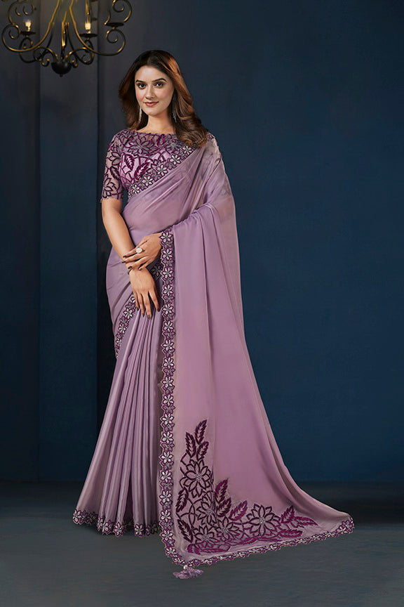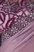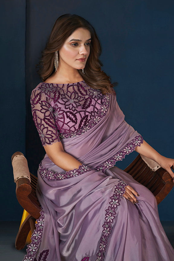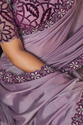 Purple Crepe Satin Silk Embroidered with Stone work Saree with Unstitched Blouse