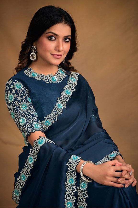 Blue Satin Silk Georgette Saree with Unstitched Blouse