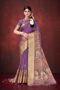 Purple Litchi checks silk Kalmkari Digital print Saree