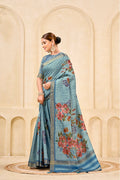 Sky Blue Signora Zari Check Silk Floral Digital Print with Foil Print Saree